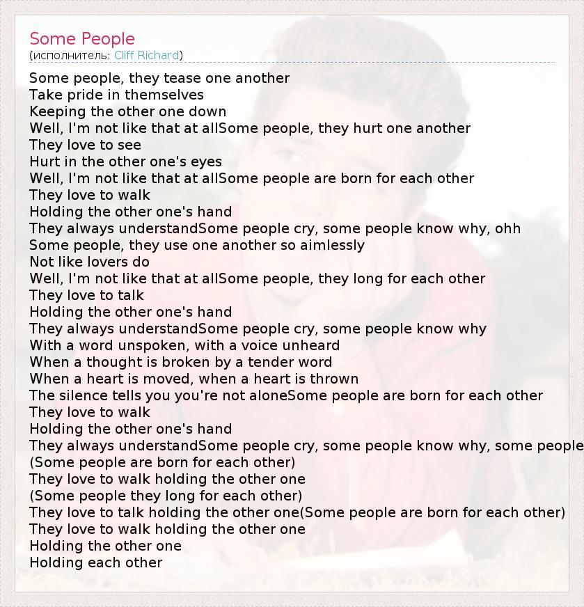 Some people, they tease one another Take pride in themselves Keeping the other one down Well, I'm not like that at allSome people, they hurt one another They love to see Hurt in the other one's eyes Well, I'm not like that at allSome people are born for each other They love to walk Holding the other one's hand They always understandSome people cry, some people know why, ohh Some people, they use one another so aimlessly Not like lovers do Well, I'm not like that at allSome people, they long for each other They love to talk Holding the other one's hand They always understandSome people cry, some people know why With a word unspoken, with a voice unheard When a thought is broken by a tender word When a heart is moved, when a heart is thrown The silence tells you you're not aloneSome people are born for each other They love to walk Holding the other one's hand They always understandSome people cry, some people know why, some people (Some people are born for each other) They love to walk holding the other one (Some people they long for each other) They love to talk holding the other one(Some people are born for each other) They love to walk holding the other one Holding the other one Holding each other
