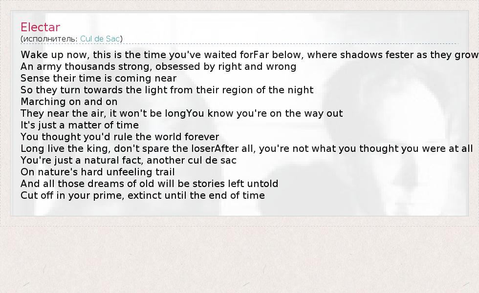 Wake up now, this is the time you've waited forFar below, where shadows fester as they grow An army thousands strong, obsessed by right and wrong Sense their time is coming near So they turn towards the light from their region of the night Marching on and on They near the air, it won't be longYou know you're on the way out It's just a matter of time You thought you'd rule the world forever Long live the king, don't spare the loserAfter all, you're not what you thought you were at all You're just a natural fact, another cul de sac On nature's hard unfeeling trail And all those dreams of old will be stories left untold Cut off in your prime, extinct until the end of time
