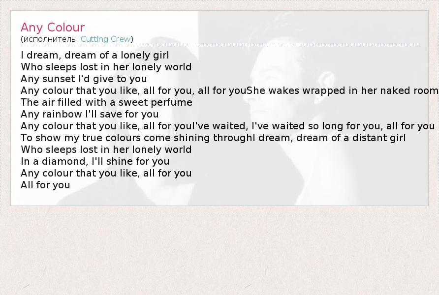 I dream, dream of a lonely girl Who sleeps lost in her lonely world Any sunset I'd give to you Any colour that you like, all for you, all for youShe wakes wrapped in her naked room The air filled with a sweet perfume Any rainbow I'll save for you Any colour that you like, all for youI've waited, I've waited so long for you, all for you To show my true colours come shining throughI dream, dream of a distant girl Who sleeps lost in her lonely world In a diamond, I'll shine for you Any colour that you like, all for you All for you