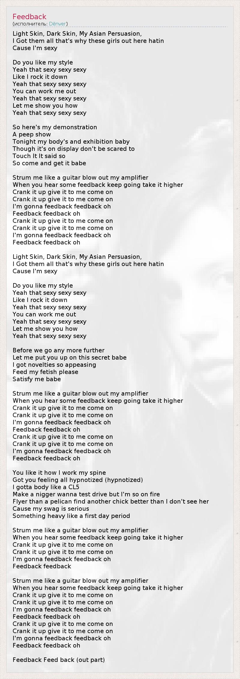 Light Skin, Dark Skin, My Asian Persuasion, I Got them all that's why these girls out here hatin Cause I'm sexy Do you like my style Yeah that sexy sexy sexy Like I rock it down Yeah that sexy sexy sexy You can work me out Yeah that sexy sexy sexy Let me show you how Yeah that sexy sexy sexy So here's my demonstration A peep show Tonight my body's and exhibition baby Though it's on display don't be scared to Touch It It said so So come and get it babe Strum me like a guitar blow out my amplifier When you hear some feedback keep going take it higher Crank it up give it to me come on Crank it up give it to me come on I'm gonna feedback feedback oh Feedback feedback oh Crank it up give it to me come on Crank it up give it to me come on I'm gonna feedback feedback oh Feedback feedback oh Light Skin, Dark Skin, My Asian Persuasion, I Got them all that's why these girls out here hatin Cause I'm sexy Do you like my style Yeah that sexy sexy sexy Like I rock it down Yeah that sexy sexy sexy You can work me out Yeah that sexy sexy sexy Let me show you how Yeah that sexy sexy sexy Before we go any more further Let me put you up on this secret babe I got novelties so appeasing Feed my fetish please Satisfy me babe Strum me like a guitar blow out my amplifier When you hear some feedback keep going take it higher Crank it up give it to me come on Crank it up give it to me come on I'm gonna feedback feedback oh Feedback feedback oh Crank it up give it to me come on Crank it up give it to me come on I'm gonna feedback feedback oh Feedback feedback oh You like it how I work my spine Got you feeling all hypnotized (hypnotized) I gotta body like a CL5 Make a nigger wanna test drive but I'm so on fire Flyer than a pelican find another chick better than I don't see her Cause my swag is serious Something heavy like a first day period Strum me like a guitar blow out my amplifier When you hear some feedback keep going take it higher Crank it up give it to me come on Crank it up give it to me come on I'm gonna feedback feedback oh Feedback feedback Strum me like a guitar blow out my amplifier When you hear some feedback keep going take it higher Crank it up give it to me come on Crank it up give it to me come on I'm gonna feedback feedback oh Feedback feedback oh Crank it up give it to me come on Crank it up give it to me come on I'm gonna feedback feedback oh Feedback feedback oh Feedback Feed back (out part)