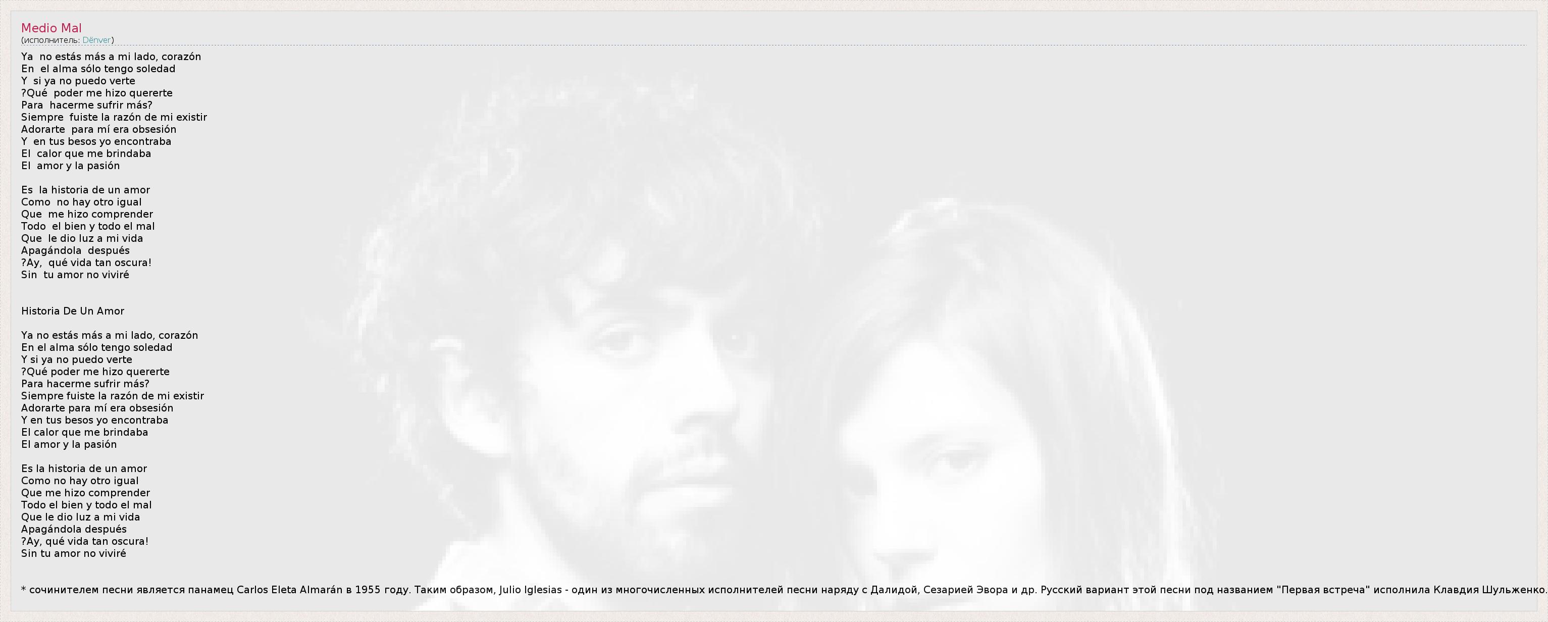 Ya no estás más a mi lado, corazón En el alma sólo tengo soledad Y si ya no puedo verte ?Qué poder me hizo quererte Para hacerme sufrir más? Siempre fuiste la razón de mi existir Adorarte para mí era obsesión Y en tus besos yo encontraba El calor que me brindaba El amor y la pasión Es la historia de un amor Como no hay otro igual Que me hizo comprender Todo el bien y todo el mal Que le dio luz a mi vida Apagándola después ?Ay, qué vida tan oscura! Sin tu amor no viviré Historia De Un Amor Ya no estás más a mi lado, corazón En el alma sólo tengo soledad Y si ya no puedo verte ?Qué poder me hizo quererte Para hacerme sufrir más? Siempre fuiste la razón de mi existir Adorarte para mí era obsesión Y en tus besos yo encontraba El calor que me brindaba El amor y la pasión Es la historia de un amor Como no hay otro igual Que me hizo comprender Todo el bien y todo el mal Que le dio luz a mi vida Apagándola después ?Ay, qué vida tan oscura! Sin tu amor no viviré * сочинителем песни является панамец Carlos Eleta Almarán в 1955 году. Таким образом, Julio Iglesias - один из многочисленных исполнителей песни наряду с Далидой, Сезарией Эвора и др. Русский вариант этой песни под названием "Первая встреча" исполнила Клавдия Шульженко.