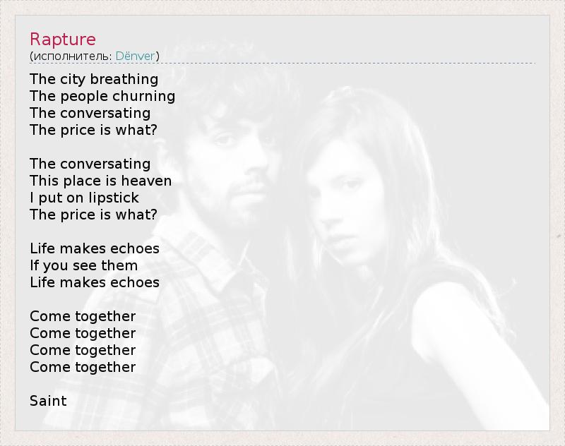 Дыхание города Вихрь людей Болтовня А какова цена? Болтовня Это место - рай Я накрвил губы помадой И какова цена? Жизнь отдается эхом Если ты их видишь Жизнь отдается эхом Объдиняйтесь Объединяйтесь