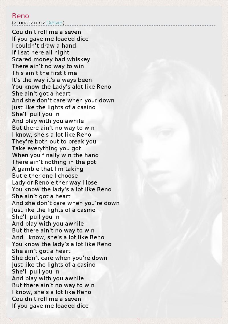 Couldn't roll me a seven If you gave me loaded dice I couldn't draw a hand If I sat here all night Scared money bad whiskey There ain't no way to win This ain't the first time It's the way it's always been You know the Lady's alot like Reno She ain't got a heart And she don't care when your down Just like the lights of a casino She'll pull you in And play with you awhile But there ain't no way to win I know, she's a lot like Reno They're both out to break you Take everything you got When you finally win the hand There ain't nothing in the pot A gamble that I'm taking But either one I choose Lady or Reno either way I lose You know the lady's a lot like Reno She ain't got a heart And she don't care when you're down Just like the lights of a casino She'll pull you in And play with you awhile But there ain't no way to win And I know, she's a lot like Reno You know the lady's a lot like Reno She ain't got a heart She don't care when you're down Just like the lights of a casino She'll pull you in And play with you awhile But there ain't no way to win I know, she's a lot like Reno Couldn't roll me a seven If you gave me loaded dice