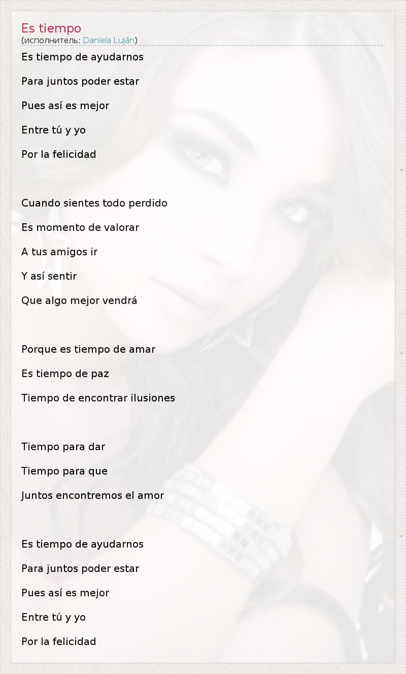 Es tiempo de ayudarnos Para juntos poder estar Pues así es mejor Entre tú y yo Por la felicidad Cuando sientes todo perdido Es momento de valorar A tus amigos ir Y así sentir Que algo mejor vendrá Porque es tiempo de amar Es tiempo de paz Tiempo de encontrar ilusiones Tiempo para dar Tiempo para que Juntos encontremos el amor Es tiempo de ayudarnos Para juntos poder estar Pues así es mejor Entre tú y yo Por la felicidad
