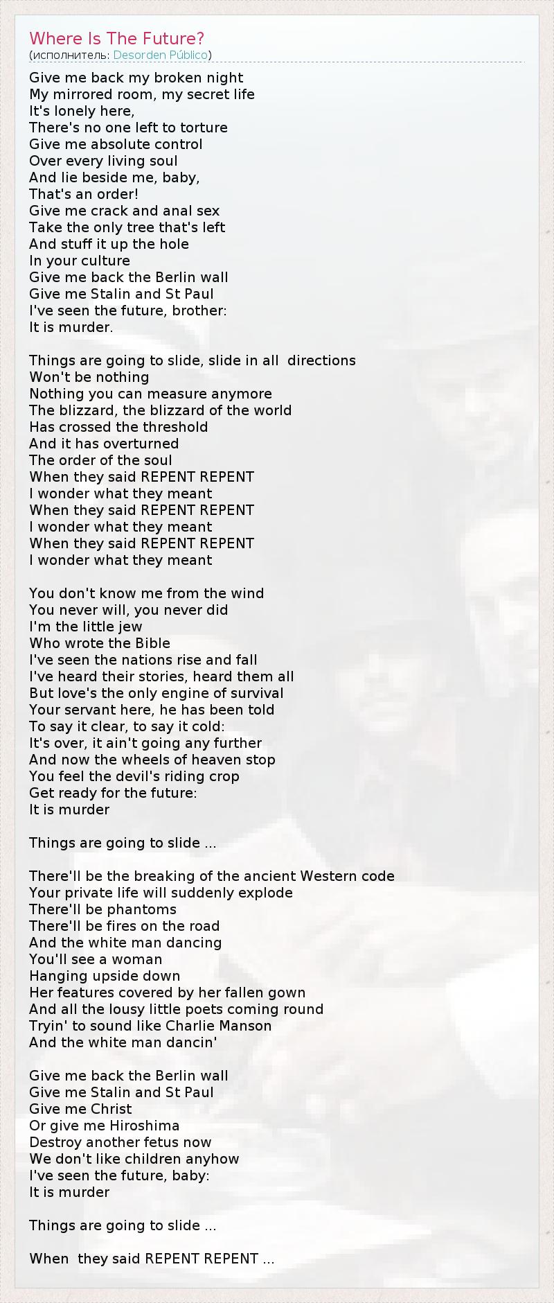 Give me back my broken night My mirrored room, my secret life It's lonely here, There's no one left to torture Give me absolute control Over every living soul And lie beside me, baby, That's an order! Give me crack and anal sex Take the only tree that's left And stuff it up the hole In your culture Give me back the Berlin wall Give me Stalin and St Paul I've seen the future, brother: It is murder. Things are going to slide, slide in all directions Won't be nothing Nothing you can measure anymore The blizzard, the blizzard of the world Has crossed the threshold And it has overturned The order of the soul When they said REPENT REPENT I wonder what they meant When they said REPENT REPENT I wonder what they meant When they said REPENT REPENT I wonder what they meant You don't know me from the wind You never will, you never did I'm the little jew Who wrote the Bible I've seen the nations rise and fall I've heard their stories, heard them all But love's the only engine of survival Your servant here, he has been told To say it clear, to say it cold: It's over, it ain't going any further And now the wheels of heaven stop You feel the devil's riding crop Get ready for the future: It is murder Things are going to slide ... There'll be the breaking of the ancient Western code Your private life will suddenly explode There'll be phantoms There'll be fires on the road And the white man dancing You'll see a woman Hanging upside down Her features covered by her fallen gown And all the lousy little poets coming round Tryin' to sound like Charlie Manson And the white man dancin' Give me back the Berlin wall Give me Stalin and St Paul Give me Christ Or give me Hiroshima Destroy another fetus now We don't like children anyhow I've seen the future, baby: It is murder Things are going to slide ... When they said REPENT REPENT ...