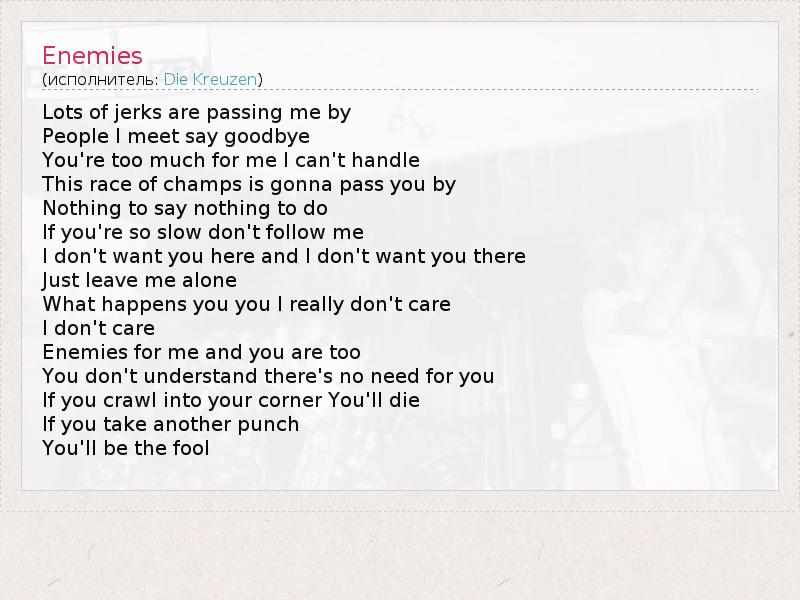 Lots of jerks are passing me by People I meet say goodbye You're too much for me I can't handle This race of champs is gonna pass you by Nothing to say nothing to do If you're so slow don't follow me I don't want you here and I don't want you there Just leave me alone What happens you you I really don't care I don't care Enemies for me and you are too You don't understand there's no need for you If you crawl into your corner You'll die If you take another punch You'll be the fool