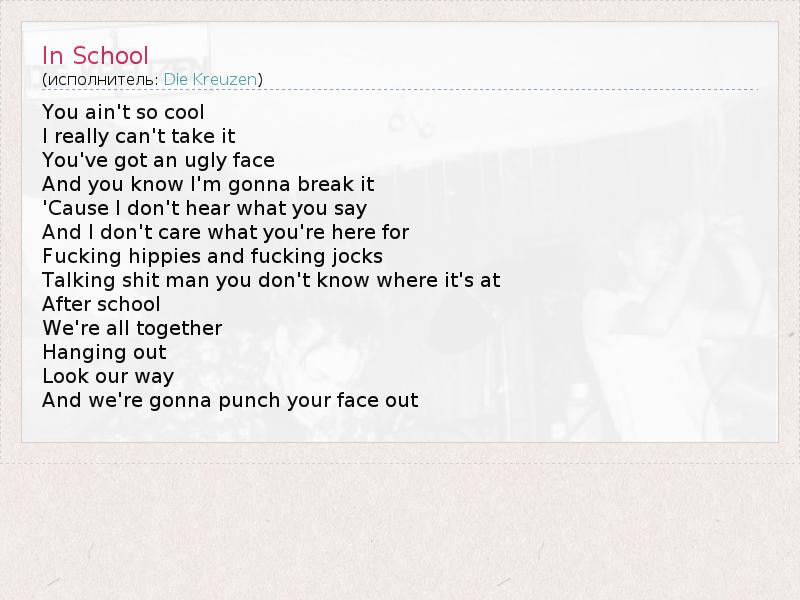 You ain't so cool I really can't take it You've got an ugly face And you know I'm gonna break it 'Cause I don't hear what you say And I don't care what you're here for Fucking hippies and fucking jocks Talking shit man you don't know where it's at After school We're all together Hanging out Look our way And we're gonna punch your face out
