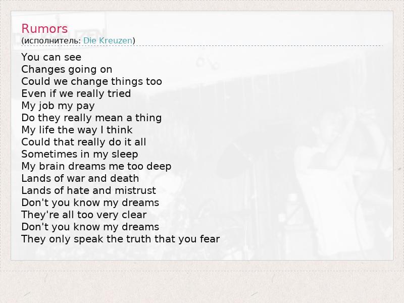 You can see Changes going on Could we change things too Even if we really tried My job my pay Do they really mean a thing My life the way I think Could that really do it all Sometimes in my sleep My brain dreams me too deep Lands of war and death Lands of hate and mistrust Don't you know my dreams They're all too very clear Don't you know my dreams They only speak the truth that you fear
