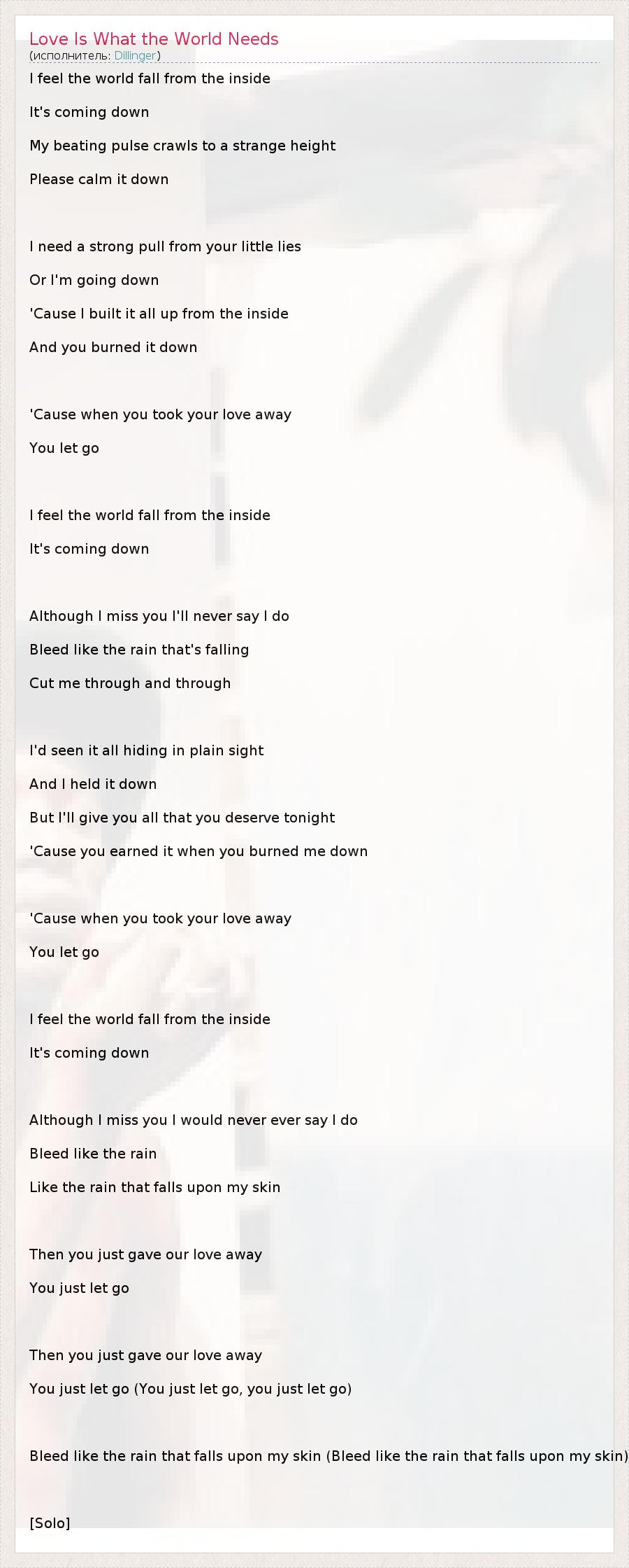 I feel the world fall from the inside It's coming down My beating pulse crawls to a strange height Please calm it down I need a strong pull from your little lies Or I'm going down 'Cause I built it all up from the inside And you burned it down 'Cause when you took your love away You let go I feel the world fall from the inside It's coming down Although I miss you I'll never say I do Bleed like the rain that's falling Cut me through and through I'd seen it all hiding in plain sight And I held it down But I'll give you all that you deserve tonight 'Cause you earned it when you burned me down 'Cause when you took your love away You let go I feel the world fall from the inside It's coming down Although I miss you I would never ever say I do Bleed like the rain Like the rain that falls upon my skin Then you just gave our love away You just let go Then you just gave our love away You just let go (You just let go, you just let go) Bleed like the rain that falls upon my skin (Bleed like the rain that falls upon my skin) [Solo]