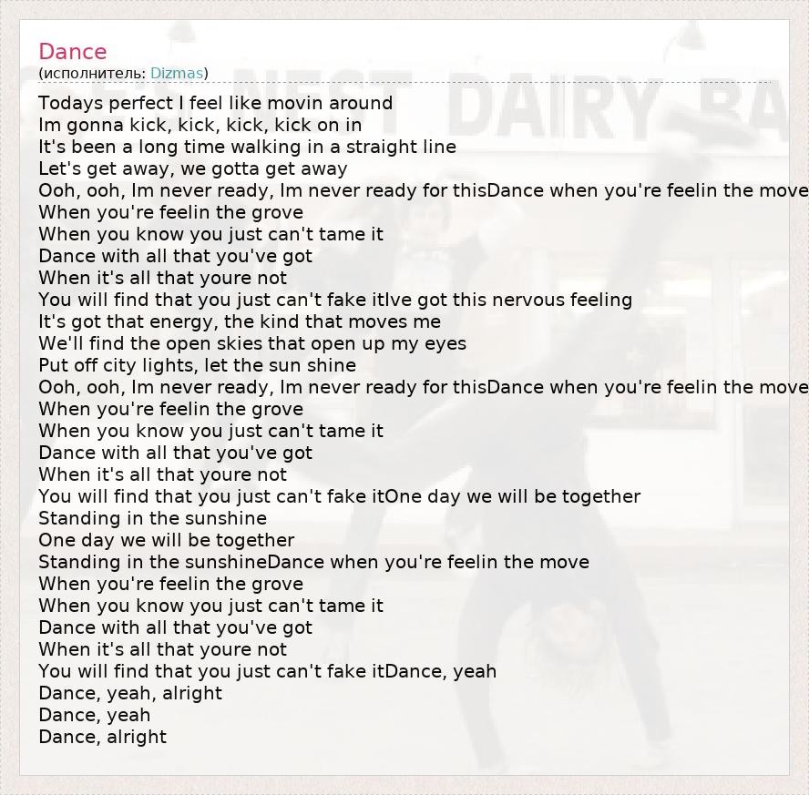 Todays perfect I feel like movin around Im gonna kick, kick, kick, kick on in It's been a long time walking in a straight line Let's get away, we gotta get away Ooh, ooh, Im never ready, Im never ready for thisDance when you're feelin the move When you're feelin the grove When you know you just can't tame it Dance with all that you've got When it's all that youre not You will find that you just can't fake itIve got this nervous feeling It's got that energy, the kind that moves me We'll find the open skies that open up my eyes Put off city lights, let the sun shine Ooh, ooh, Im never ready, Im never ready for thisDance when you're feelin the move When you're feelin the grove When you know you just can't tame it Dance with all that you've got When it's all that youre not You will find that you just can't fake itOne day we will be together Standing in the sunshine One day we will be together Standing in the sunshineDance when you're feelin the move When you're feelin the grove When you know you just can't tame it Dance with all that you've got When it's all that youre not You will find that you just can't fake itDance, yeah Dance, yeah, alright Dance, yeah Dance, alright