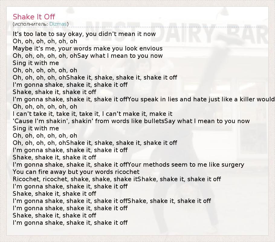 It's too late to say okay, you didn't mean it now Oh, oh, oh, oh, oh, oh Maybe it's me, your words make you look envious Oh, oh, oh, oh, oh, ohSay what I mean to you now Sing it with me Oh, oh, oh, oh, oh, oh Oh, oh, oh, oh, ohShake it, shake, shake it, shake it off I'm gonna shake, shake it, shake it off Shake, shake it, shake it off I'm gonna shake, shake it, shake it offYou speak in lies and hate just like a killer would Oh, oh, oh, oh, oh, oh I can't take it, take it, take it, I can't make it, make it 'Cause I'm shakin', shakin' from words like bulletsSay what I mean to you now Sing it with me Oh, oh, oh, oh, oh, oh Oh, oh, oh, oh, ohShake it, shake, shake it, shake it off I'm gonna shake, shake it, shake it off Shake, shake it, shake it off I'm gonna shake, shake it, shake it offYour methods seem to me like surgery You can fire away but your words ricochet Ricochet, ricochet, shake, shake, shake itShake, shake it, shake it off I'm gonna shake, shake it, shake it off Shake, shake it, shake it off I'm gonna shake, shake it, shake it offShake, shake it, shake it off I'm gonna shake, shake it, shake it off Shake, shake it, shake it off I'm gonna shake, shake it, shake it off