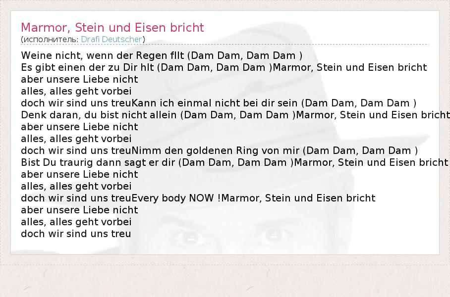 Weine nicht, wenn der Regen fllt (Dam Dam, Dam Dam ) Es gibt einen der zu Dir hlt (Dam Dam, Dam Dam )Marmor, Stein und Eisen bricht aber unsere Liebe nicht alles, alles geht vorbei doch wir sind uns treuKann ich einmal nicht bei dir sein (Dam Dam, Dam Dam ) Denk daran, du bist nicht allein (Dam Dam, Dam Dam )Marmor, Stein und Eisen bricht aber unsere Liebe nicht alles, alles geht vorbei doch wir sind uns treuNimm den goldenen Ring von mir (Dam Dam, Dam Dam ) Bist Du traurig dann sagt er dir (Dam Dam, Dam Dam )Marmor, Stein und Eisen bricht aber unsere Liebe nicht alles, alles geht vorbei doch wir sind uns treuEvery body NOW !Marmor, Stein und Eisen bricht aber unsere Liebe nicht alles, alles geht vorbei doch wir sind uns treu