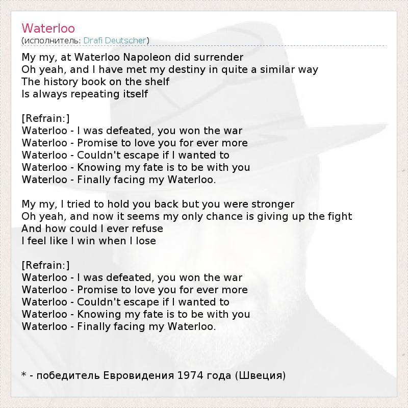 My my, at Waterloo Napoleon did surrender Oh yeah, and I have met my destiny in quite a similar way The history book on the shelf Is always repeating itself [Refrain:] Waterloo - I was defeated, you won the war Waterloo - Promise to love you for ever more Waterloo - Couldn't escape if I wanted to Waterloo - Knowing my fate is to be with you Waterloo - Finally facing my Waterloo. My my, I tried to hold you back but you were stronger Oh yeah, and now it seems my only chance is giving up the fight And how could I ever refuse I feel like I win when I lose [Refrain:] Waterloo - I was defeated, you won the war Waterloo - Promise to love you for ever more Waterloo - Couldn't escape if I wanted to Waterloo - Knowing my fate is to be with you Waterloo - Finally facing my Waterloo. * - победитель Евровидения 1974 года (Швеция)