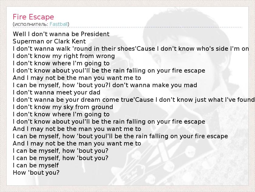 А как ты думаешь, о чем песня "Fire Escape" ?