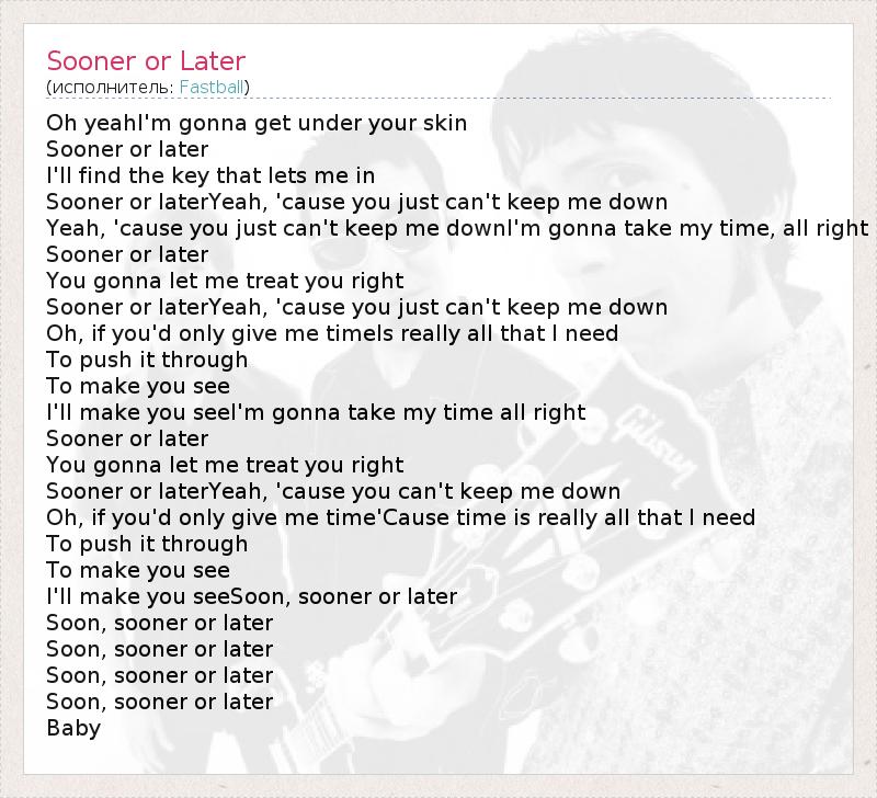 Oh yeahI'm gonna get under your skin Sooner or later I'll find the key that lets me in Sooner or laterYeah, 'cause you just can't keep me down Yeah, 'cause you just can't keep me downI'm gonna take my time, all right Sooner or later You gonna let me treat you right Sooner or laterYeah, 'cause you just can't keep me down Oh, if you'd only give me timeIs really all that I need To push it through To make you see I'll make you seeI'm gonna take my time all right Sooner or later You gonna let me treat you right Sooner or laterYeah, 'cause you can't keep me down Oh, if you'd only give me time'Cause time is really all that I need To push it through To make you see I'll make you seeSoon, sooner or later Soon, sooner or later Soon, sooner or later Soon, sooner or later Soon, sooner or later Baby
