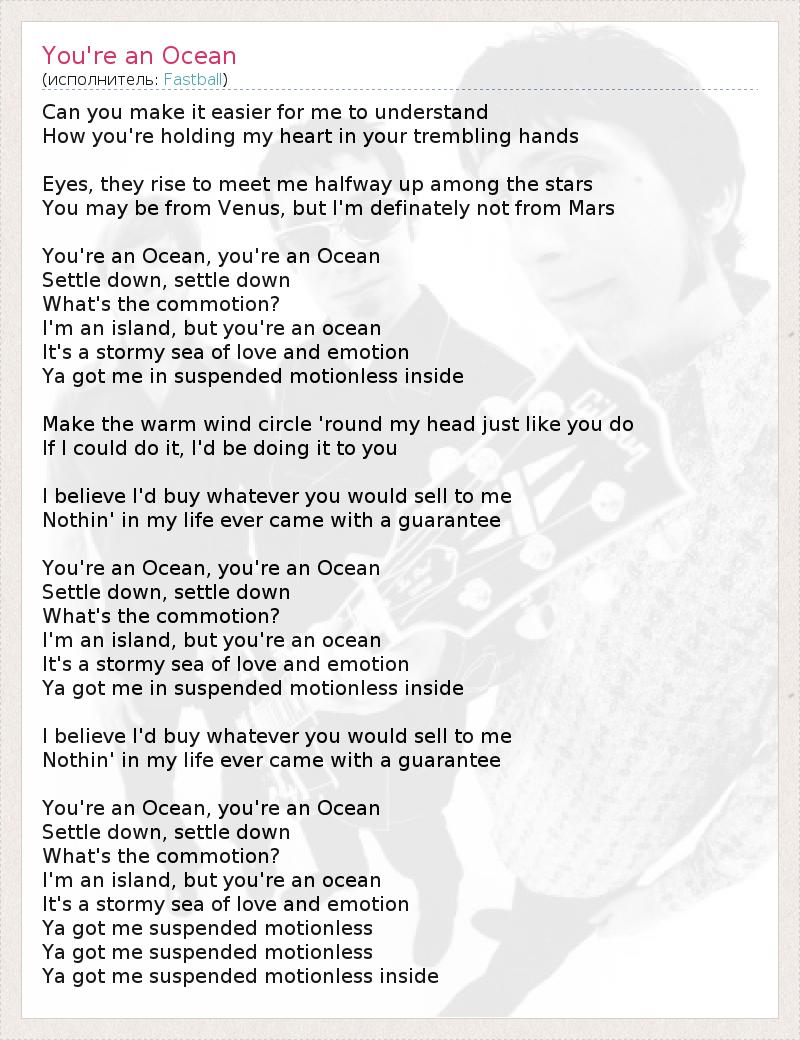 Can you make it easier for me to understand How you're holding my heart in your trembling hands Eyes, they rise to meet me halfway up among the stars You may be from Venus, but I'm definately not from Mars You're an Ocean, you're an Ocean Settle down, settle down What's the commotion? I'm an island, but you're an ocean It's a stormy sea of love and emotion Ya got me in suspended motionless inside Make the warm wind circle 'round my head just like you do If I could do it, I'd be doing it to you I believe I'd buy whatever you would sell to me Nothin' in my life ever came with a guarantee You're an Ocean, you're an Ocean Settle down, settle down What's the commotion? I'm an island, but you're an ocean It's a stormy sea of love and emotion Ya got me in suspended motionless inside I believe I'd buy whatever you would sell to me Nothin' in my life ever came with a guarantee You're an Ocean, you're an Ocean Settle down, settle down What's the commotion? I'm an island, but you're an ocean It's a stormy sea of love and emotion Ya got me suspended motionless Ya got me suspended motionless Ya got me suspended motionless inside
