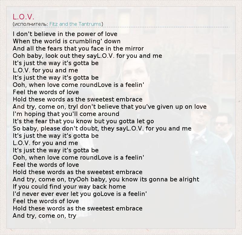 I don't believe in the power of love When the world is crumbling' down And all the fears that you face in the mirror Ooh baby, look out they sayL.O.V. for you and me It's just the way it's gotta be L.O.V. for you and me It's just the way it's gotta be Ooh, when love come roundLove is a feelin' Feel the words of love Hold these words as the sweetest embrace And try, come on, tryI don't believe that you've given up on love I'm hoping that you'll come around It's the fear that you know but you gotta let go So baby, please don't doubt, they sayL.O.V. for you and me It's just the way it's gotta be L.O.V. for you and me It's just the way it's gotta be Ooh, when love come roundLove is a feelin' Feel the words of love Hold these words as the sweetest embrace And try, come on, tryOoh baby, you know its gonna be alright If you could find your way back home I'd never ever ever let you goLove is a feelin' Feel the words of love Hold these words as the sweetest embrace And try, come on, try