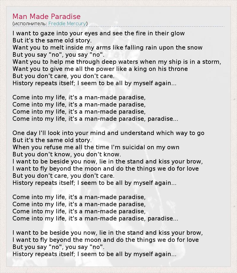 I want to gaze into your eyes and see the fire in their glow But it's the same old story. Want you to melt inside my arms like falling rain upon the snow But you say "no", you say "no". Want you to help me through deep waters when my ship is in a storm, Want you to give me all the power like a king on his throne But you don't care, you don't care. History repeats itself; I seem to be all by myself again... Come into my life, it's a man-made paradise, Come into my life, it's a man-made paradise, Come into my life, it's a man-made paradise, Come into my life, it's a man-made paradise, paradise... One day I'll look into your mind and understand which way to go But it's the same old story. When you refuse me all the time I'm suicidal on my own But you don't know, you don't know. I want to be beside you now, lie in the stand and kiss your brow, I want to fly beyond the moon and do the things we do for love But you don't care, you don't care. History repeats itself; I seem to be all by myself again... Come into my life, it's a man-made paradise, Come into my life, it's a man-made paradise, Come into my life, it's a man-made paradise, Come into my life, it's a man-made paradise, paradise... I want to be beside you now, lie in the stand and kiss your brow, I want to fly beyond the moon and do the things we do for love But you say "no", you say "no". History repeats itself; I seem to be all by myself again...