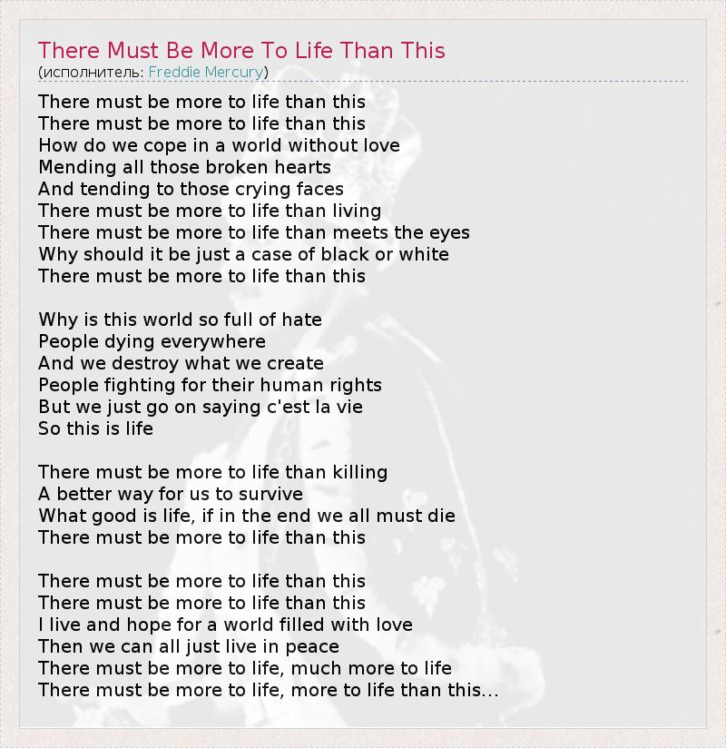 There must be more to life than this There must be more to life than this How do we cope in a world without love Mending all those broken hearts And tending to those crying faces There must be more to life than living There must be more to life than meets the eyes Why should it be just a case of black or white There must be more to life than this Why is this world so full of hate People dying everywhere And we destroy what we create People fighting for their human rights But we just go on saying c'est la vie So this is life There must be more to life than killing A better way for us to survive What good is life, if in the end we all must die There must be more to life than this There must be more to life than this There must be more to life than this I live and hope for a world filled with love Then we can all just live in peace There must be more to life, much more to life There must be more to life, more to life than this…