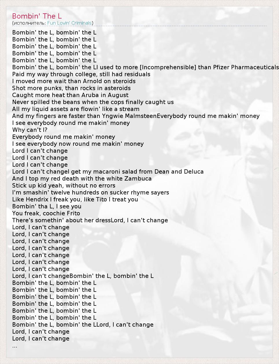 Bombin' the L, bombin' the L Bombin' the L, bombin' the L Bombin' the L, bombin' the L Bombin' the L, bombin' the L Bombin' the L, bombin' the L Bombin' the L, bombin' the LI used to more [Incomprehensible] than Pfizer Pharmaceuticals Paid my way through college, still had residuals I moved more wait than Arnold on steroids Shot more punks, than rocks in asteroids Caught more heat than Aruba in August Never spilled the beans when the cops finally caught us All my liquid assets are flowin' like a stream And my fingers are faster than Yngwie MalmsteenEverybody round me makin' money I see everybody round me makin' money Why can't I? Everybody round me makin' money I see everybody now round me makin' money Lord I can't change Lord I can't change Lord I can't change Lord I can't changeI get my macaroni salad from Dean and Deluca And I top my red death with the white Zambuca Stick up kid yeah, without no errors I'm smashin' twelve hundreds on sucker rhyme sayers Like Hendrix I freak you, like Tito I treat you Bombin' tha L, I see you You freak, coochie Frito There's somethin' about her dressLord, I can't change Lord, I can't change Lord, I can't change Lord, I can't change Lord, I can't change Lord, I can't change Lord, I can't change Lord, I can't change Lord, I can't changeBombin' the L, bombin' the L Bombin' the L, bombin' the L Bombin' the L, bombin' the L Bombin' the L, bombin' the L Bombin' the L, bombin' the L Bombin' the L, bombin' the L Bombin' the L, bombin' the L Bombin' the L, bombin' the LLord, I can't change Lord, I can't change Lord, I can't change ...
