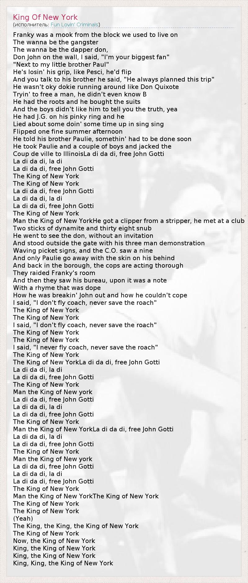 Franky was a mook from the block we used to live on The wanna be the gangster The wanna be the dapper don, Don John on the wall, I said, "I'm your biggest fan" "Next to my little brother Paul" He's losin' his grip, like Pesci, he'd flip And you talk to his brother he said, "He always planned this trip" He wasn't oky dokie running around like Don Quixote Tryin' to free a man, he didn't even know B He had the roots and he bought the suits And the boys didn't like him to tell you the truth, yea He had J.G. on his pinky ring and he Lied about some doin' some time up in sing sing Flipped one fine summer afternoon He told his brother Paulie, somethin' had to be done soon He took Paulie and a couple of boys and jacked the Coup de ville to IllinoisLa di da di, free John Gotti La di da di, la di La di da di, free John Gotti The King of New York The King of New York La di da di, free John Gotti La di da di, la di La di da di, free John Gotti The King of New York Man the King of New YorkHe got a clipper from a stripper, he met at a club Two sticks of dynamite and thirty eight snub He went to see the don, without an invitation And stood outside the gate with his three man demonstration Waving picket signs, and the C.O. saw a nine And only Paulie go away with the skin on his behind And back in the borough, the cops are acting thorough They raided Franky's room And then they saw his bureau, upon it was a note With a rhyme that was dope How he was breakin' John out and how he couldn't cope I said, "I don't fly coach, never save the roach" The King of New York The King of New York I said, "I don't fly coach, never save the roach" The King of New York The King of New York I said, "I never fly coach, never save the roach" The King of New York The King of New YorkLa di da di, free John Gotti La di da di, la di La di da di, free John Gotti The King of New York Man the King of New york La di da di, free John Gotti La di da di, la di La di da di, free John Gotti The King of New York Man the King of New YorkLa di da di, free John Gotti La di da di, la di La di da di, free John Gotti The King of New York Man the King of New york La di da di, free John Gotti La di da di, la di La di da di, free John Gotti The King of New York Man the King of New YorkThe King of New York The King of New York The King of New York (Yeah) The King, the King, the King of New York The King of New York Now, the King of New York King, the King of New York King, the King of New York King, King, the King of New York