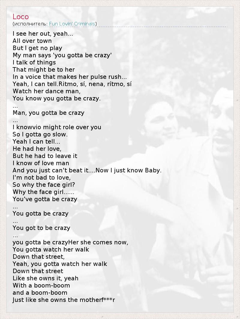 I see her out, yeah... All over town But I get no play My man says 'you gotta be crazy' I talk of things That might be to her In a voice that makes her pulse rush... Yeah, I can tell.Ritmo, sí, nena, rítmo, sí Watch her dance man, You know you gotta be crazy. ... Man, you gotta be crazy ... I knowvio might role over you So I gotta go slow. Yeah I can tell... He had her love, But he had to leave it I know of love man And you just can't beat it....Now I just know Baby. I'm not bad to love, So why the face girl? Why the face girl...... You've gotta be crazy ... You gotta be crazy ... You got to be crazy ... you gotta be crazyHer she comes now, You gotta watch her walk Down that street, Yeah, you gotta watch her walk Down that street Like she owns it, yeah With a boom-boom and a boom-boom Just like she owns the motherf***r