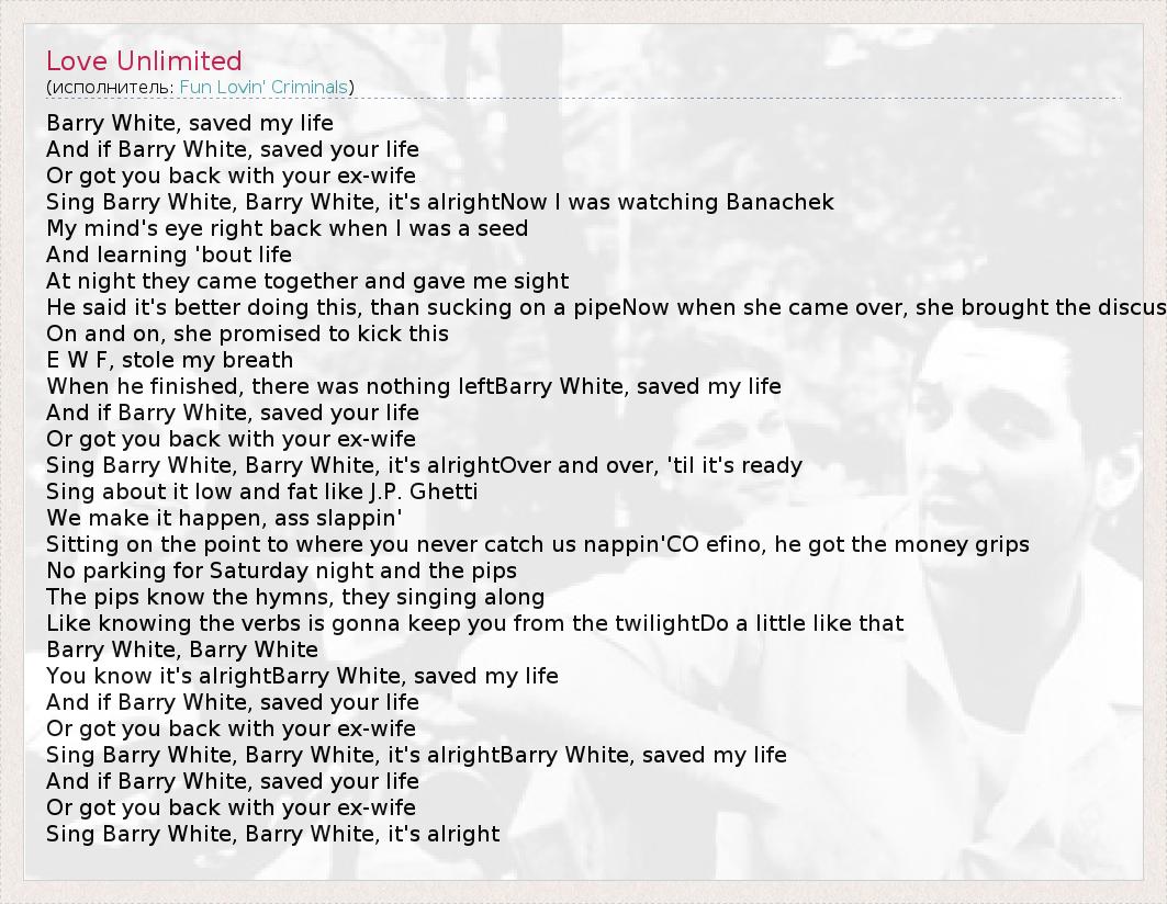 Barry White, saved my life And if Barry White, saved your life Or got you back with your ex-wife Sing Barry White, Barry White, it's alrightNow I was watching Banachek My mind's eye right back when I was a seed And learning 'bout life At night they came together and gave me sight He said it's better doing this, than sucking on a pipeNow when she came over, she brought the discus On and on, she promised to kick this E W F, stole my breath When he finished, there was nothing leftBarry White, saved my life And if Barry White, saved your life Or got you back with your ex-wife Sing Barry White, Barry White, it's alrightOver and over, 'til it's ready Sing about it low and fat like J.P. Ghetti We make it happen, ass slappin' Sitting on the point to where you never catch us nappin'CO efino, he got the money grips No parking for Saturday night and the pips The pips know the hymns, they singing along Like knowing the verbs is gonna keep you from the twilightDo a little like that Barry White, Barry White You know it's alrightBarry White, saved my life And if Barry White, saved your life Or got you back with your ex-wife Sing Barry White, Barry White, it's alrightBarry White, saved my life And if Barry White, saved your life Or got you back with your ex-wife Sing Barry White, Barry White, it's alright
