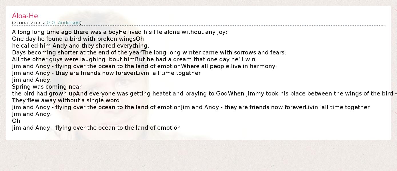 A long long time ago there was a boyHe lived his life alone without any joy; One day he found a bird with broken wingsOh he called him Andy and they shared everything. Days becoming shorter at the end of the yearThe long long winter came with sorrows and fears. All the other guys were laughing 'bout himBut he had a dream that one day he'll win. Jim and Andy - flying over the ocean to the land of emotionWhere all people live in harmony. Jim and Andy - they are friends now foreverLivin' all time together Jim and Andy. Spring was coming near the bird had grown upAnd everyone was getting heatet and praying to GodWhen Jimmy took his place between the wings of the bird - They flew away without a single word. Jim and Andy - flying over the ocean to the land of emotionJim and Andy - they are friends now foreverLivin' all time together Jim and Andy. Oh Jim and Andy - flying over the ocean to the land of emotion