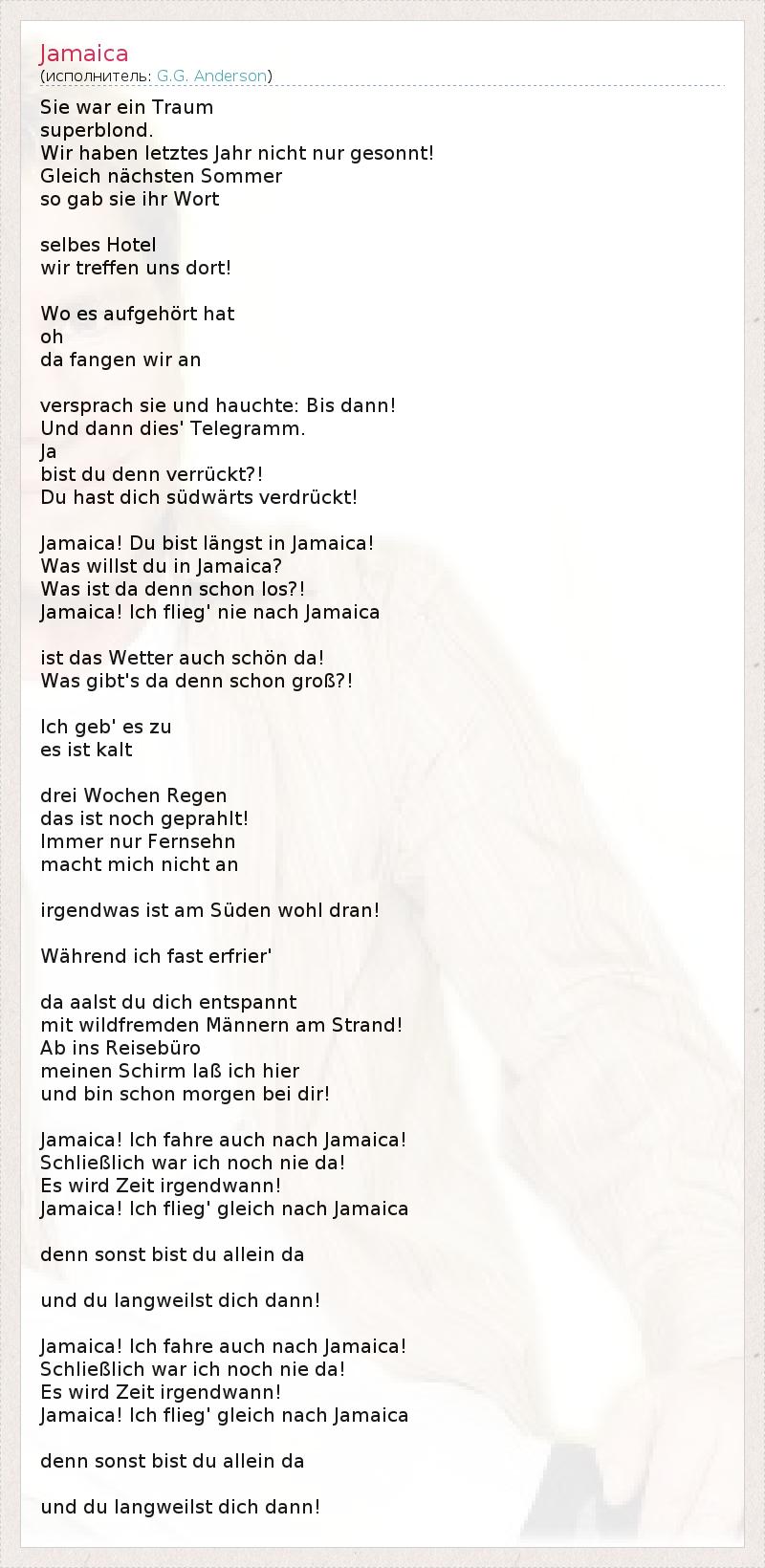 Sie war ein Traum superblond. Wir haben letztes Jahr nicht nur gesonnt! Gleich nächsten Sommer so gab sie ihr Wort selbes Hotel wir treffen uns dort! Wo es aufgehört hat oh da fangen wir an versprach sie und hauchte: Bis dann! Und dann dies' Telegramm. Ja bist du denn verrückt?! Du hast dich südwärts verdrückt! Jamaica! Du bist längst in Jamaica! Was willst du in Jamaica? Was ist da denn schon los?! Jamaica! Ich flieg' nie nach Jamaica ist das Wetter auch schön da! Was gibt's da denn schon groß?! Ich geb' es zu es ist kalt drei Wochen Regen das ist noch geprahlt! Immer nur Fernsehn macht mich nicht an irgendwas ist am Süden wohl dran! Während ich fast erfrier' da aalst du dich entspannt mit wildfremden Männern am Strand! Ab ins Reisebüro meinen Schirm laß ich hier und bin schon morgen bei dir! Jamaica! Ich fahre auch nach Jamaica! Schließlich war ich noch nie da! Es wird Zeit irgendwann! Jamaica! Ich flieg' gleich nach Jamaica denn sonst bist du allein da und du langweilst dich dann! Jamaica! Ich fahre auch nach Jamaica! Schließlich war ich noch nie da! Es wird Zeit irgendwann! Jamaica! Ich flieg' gleich nach Jamaica denn sonst bist du allein da und du langweilst dich dann!