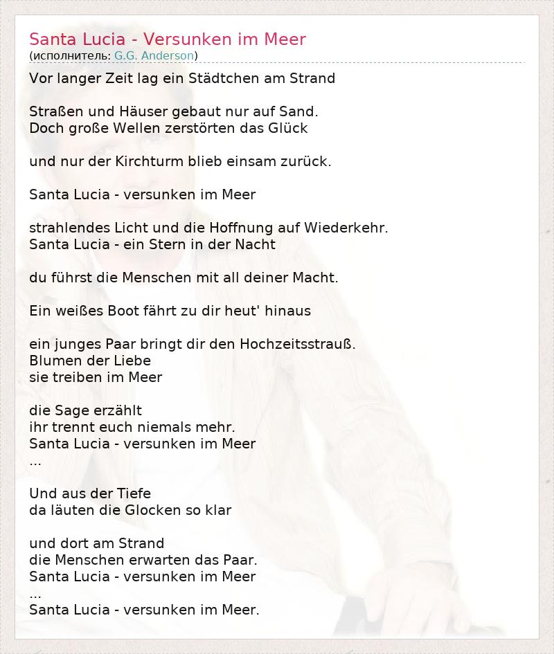 Vor langer Zeit lag ein Städtchen am Strand Straßen und Häuser gebaut nur auf Sand. Doch große Wellen zerstörten das Glück und nur der Kirchturm blieb einsam zurück. Santa Lucia - versunken im Meer strahlendes Licht und die Hoffnung auf Wiederkehr. Santa Lucia - ein Stern in der Nacht du führst die Menschen mit all deiner Macht. Ein weißes Boot fährt zu dir heut' hinaus ein junges Paar bringt dir den Hochzeitsstrauß. Blumen der Liebe sie treiben im Meer die Sage erzählt ihr trennt euch niemals mehr. Santa Lucia - versunken im Meer ... Und aus der Tiefe da läuten die Glocken so klar und dort am Strand die Menschen erwarten das Paar. Santa Lucia - versunken im Meer ... Santa Lucia - versunken im Meer.