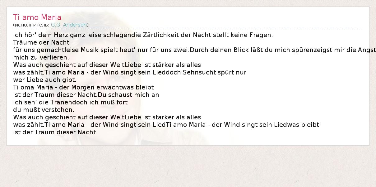 Ich hör' dein Herz ganz leise schlagendie Zärtlichkeit der Nacht stellt keine Fragen. Träume der Nacht für uns gemachtleise Musik spielt heut' nur für uns zwei.Durch deinen Blick läßt du mich spürenzeigst mir die Angst mich zu verlieren. Was auch geschieht auf dieser WeltLiebe ist stärker als alles was zählt.Ti amo Maria - der Wind singt sein Lieddoch Sehnsucht spürt nur wer Liebe auch gibt. Ti oma Maria - der Morgen erwachtwas bleibt ist der Traum dieser Nacht.Du schaust mich an ich seh' die Tränendoch ich muß fort du mußt verstehen. Was auch geschieht auf dieser WeltLiebe ist stärker als alles was zählt.Ti amo Maria - der Wind singt sein LiedTi amo Maria - der Wind singt sein Liedwas bleibt ist der Traum dieser Nacht.