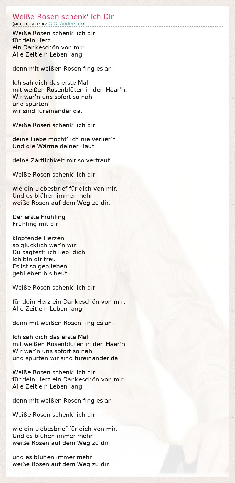Weiße Rosen schenk' ich dir für dein Herz ein Dankeschön von mir. Alle Zeit ein Leben lang denn mit weißen Rosen fing es an. Ich sah dich das erste Mal mit weißen Rosenblüten in den Haar'n. Wir war'n uns sofort so nah und spürten wir sind füreinander da. Weiße Rosen schenk' ich dir deine Liebe möcht' ich nie verlier'n. Und die Wärme deiner Haut deine Zärtlichkeit mir so vertraut. Weiße Rosen schenk' ich dir wie ein Liebesbrief für dich von mir. Und es blühen immer mehr weiße Rosen auf dem Weg zu dir. Der erste Frühling Frühling mit dir klopfende Herzen so glücklich war'n wir. Du sagtest: ich lieb' dich ich bin dir treu! Es ist so geblieben geblieben bis heut'! Weiße Rosen schenk' ich dir für dein Herz ein Dankeschön von mir. Alle Zeit ein Leben lang denn mit weißen Rosen fing es an. Ich sah dich das erste Mal mit weißen Rosenblüten in den Haar'n. Wir war'n uns sofort so nah und spürten wir sind füreinander da. Weiße Rosen schenk' ich dir für dein Herz ein Dankeschön von mir. Alle Zeit ein Leben lang denn mit weißen Rosen fing es an. Weiße Rosen schenk' ich dir wie ein Liebesbrief für dich von mir. Und es blühen immer mehr weiße Rosen auf dem Weg zu dir und es blühen immer mehr weiße Rosen auf dem Weg zu dir.
