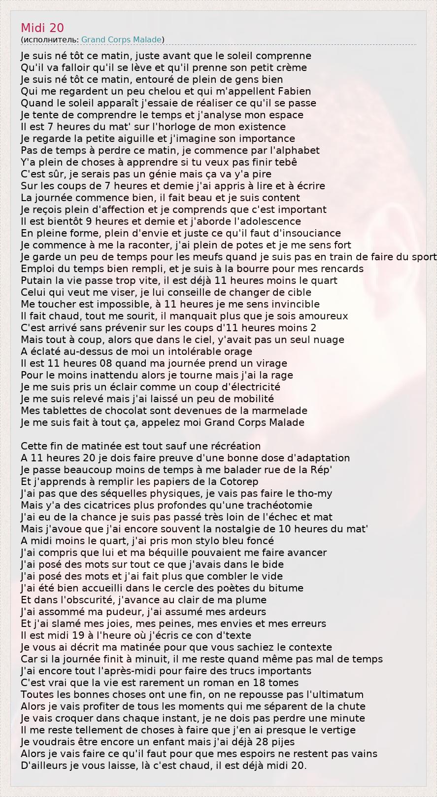 Это интересно:Grand Corps Malade, often abbreviated GCM, is the alias of slam poet Fabien Marsaud, born on July 31, 1977 in Le Blanc-Mesnil, Seine-Saint-Denis, France.On July 31, 1997, after a bad dive in a pool in Saint-Denis, Marsaud displaced his spine and was told he would never walk again. However, in 1999 after a year of treatment, he was able to walk again. The alias Grand Corps Malade (meaning "Tall Sick Body" in French) is a reference to his condition as well as his height (nearly 6'5").He made his first appearance in a bar in Paris on October 23, 2003, after which he started workshops to introduce youngsters in his community to slam poetry. Soon afterwards a friend of... продолжение