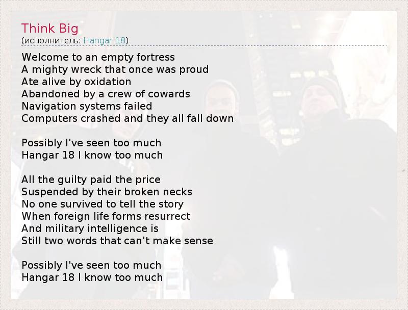 Добро пожаловать в пустую крепость. Огромные развалины, что когда-то были высоки, Разъедены ржавчиной, Покинуты командой трусов. Навигационные системы отказали, Компьютеры разбиты, и все терпят неудачу. Возможно, я видел слишком много, Об ангаре 18 я знаю слишком много. Все виновные заплатили, Подвешенные за сломанные шеи. Никто не выжил, чтобы рассказать историю, Когда чуждые формы жизни воскресают, И военная разведка - Все еще два слова, не имеющие смысла. Возможно, я видел слишком много, Об ангаре 18 я знаю слишком много.