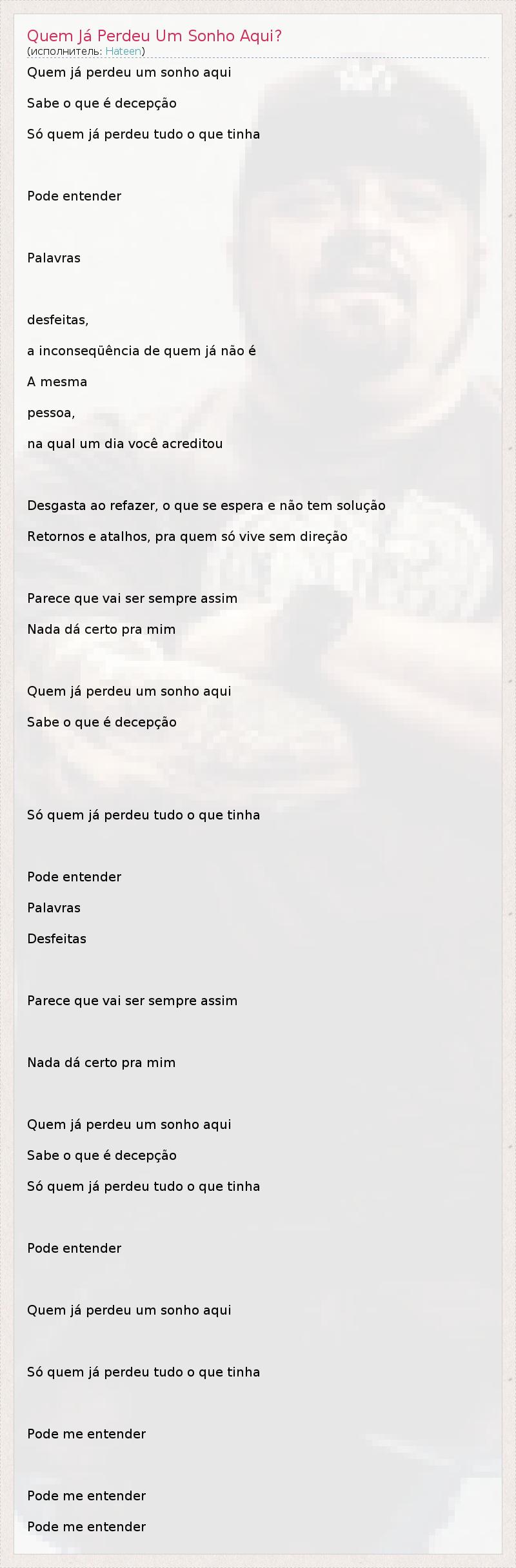 Quem já perdeu um sonho aqui Sabe o que é decepção Só quem já perdeu tudo o que tinha Pode entender Palavras desfeitas, a inconseqüência de quem já não é A mesma pessoa, na qual um dia você acreditou Desgasta ao refazer, o que se espera e não tem solução Retornos e atalhos, pra quem só vive sem direção Parece que vai ser sempre assim Nada dá certo pra mim Quem já perdeu um sonho aqui Sabe o que é decepção Só quem já perdeu tudo o que tinha Pode entender Palavras Desfeitas Parece que vai ser sempre assim Nada dá certo pra mim Quem já perdeu um sonho aqui Sabe o que é decepção Só quem já perdeu tudo o que tinha Pode entender Quem já perdeu um sonho aqui Só quem já perdeu tudo o que tinha Pode me entender Pode me entender Pode me entender