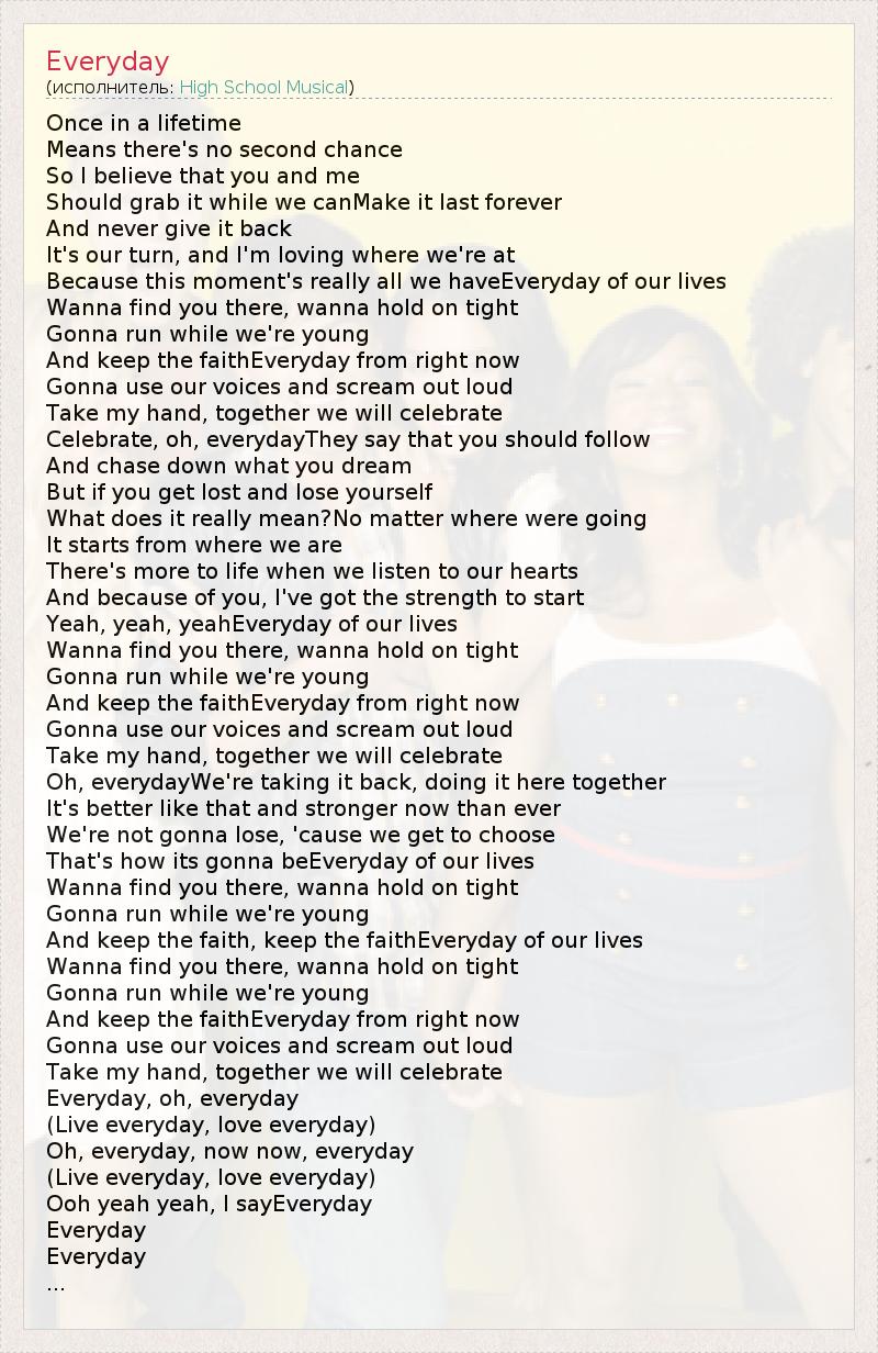 Once in a lifetime Means there's no second chance So I believe that you and me Should grab it while we canMake it last forever And never give it back It's our turn, and I'm loving where we're at Because this moment's really all we haveEveryday of our lives Wanna find you there, wanna hold on tight Gonna run while we're young And keep the faithEveryday from right now Gonna use our voices and scream out loud Take my hand, together we will celebrate Celebrate, oh, everydayThey say that you should follow And chase down what you dream But if you get lost and lose yourself What does it really mean?No matter where were going It starts from where we are There's more to life when we listen to our hearts And because of you, I've got the strength to start Yeah, yeah, yeahEveryday of our lives Wanna find you there, wanna hold on tight Gonna run while we're young And keep the faithEveryday from right now Gonna use our voices and scream out loud Take my hand, together we will celebrate Oh, everydayWe're taking it back, doing it here together It's better like that and stronger now than ever We're not gonna lose, 'cause we get to choose That's how its gonna beEveryday of our lives Wanna find you there, wanna hold on tight Gonna run while we're young And keep the faith, keep the faithEveryday of our lives Wanna find you there, wanna hold on tight Gonna run while we're young And keep the faithEveryday from right now Gonna use our voices and scream out loud Take my hand, together we will celebrate Everyday, oh, everyday (Live everyday, love everyday) Oh, everyday, now now, everyday (Live everyday, love everyday) Ooh yeah yeah, I sayEveryday Everyday Everyday ...