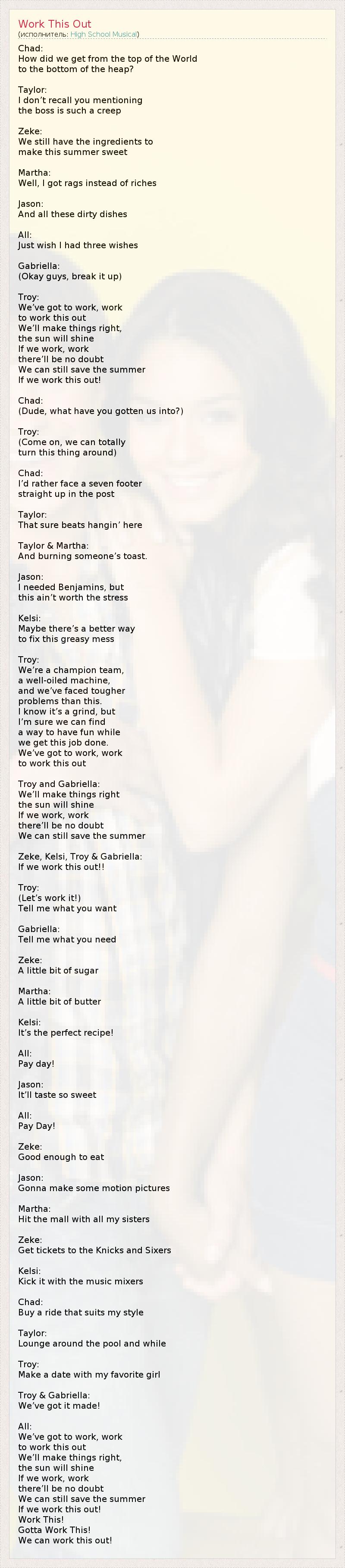 Чад: Как мы дошли с вершины мира на дно кучу? Тейлор: Я не помню, вы упоминания Хозяин такой ползучести Зик: У нас еще есть ингредиенты Сделать это лето сладкое Марта: Ну, я получил лохмотьях вместо богатства Джейсон: И все это грязная посуда Все: Просто бы у меня было три желания Gabriella: (Ладно ребята, Break It Up) Troy: Нам надо работать, работать решить эту проблему Мы будем делать все правильно, Солнце будет светить Если работа, работа не будет никаких сомнений Мы все еще можем сохранить лето Если мы будем работать эта Out! Чад: (Dude, что вы получили в нас?) Troy: (Ну, мы можем полностью свою очередь, это вещи вокруг) Чад: Я лучше лицом семь Footer прямо на посту Тейлор: Это уверены Hangin бьет "здесь Тейлор Марта: И сжигание кто-то произнес тост. Джейсон: Мне нужно Benjamins, но это не стоит подчеркнуть Келси: Может быть, есть лучший путь Чтобы исправить эту жирную Mess Troy: Мы чемпиона команда, хорошо отлаженная машина, и мы перед жестким проблем, чем это. Я знаю, что молоть, но Я уверена, что мы можем найти способ развлечься в то время как получить эту работу. Нам надо работать, работать решить эту проблему Трои и Габриэлла: Мы будем делать все правильно Солнце будет светить Если работа, работа не будет никаких сомнений Мы все еще можем сохранить лето Зик, Келси, Троя: Нам надо работать, работать решить эту проблему Мы будем делать все правильно, Солнце будет светить Если работа, работа не будет никаких сомнений Мы все еще можем сохранить лето Если мы будем работать эта Out! Эта работа! Gotta Work This! Мы можем работать This Out!