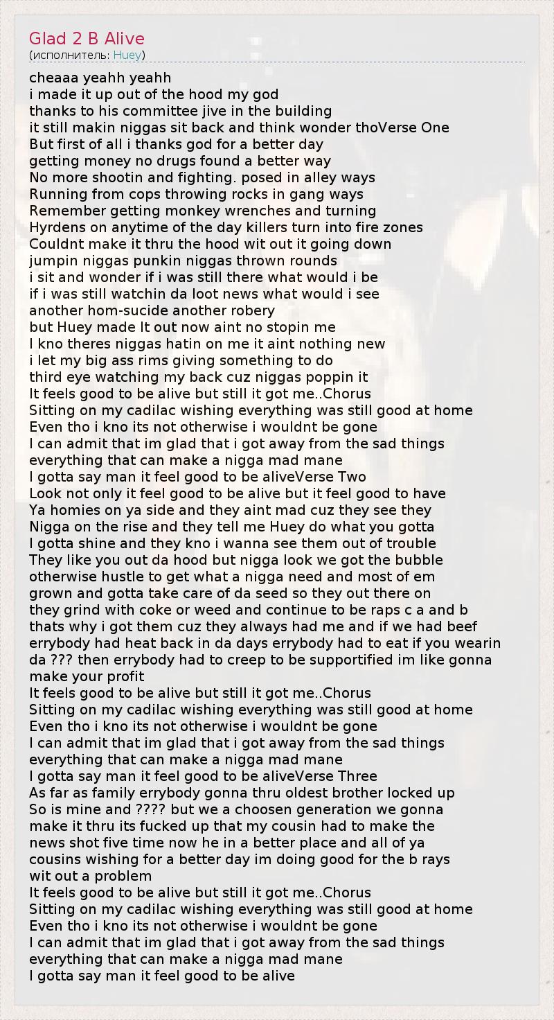 cheaaa yeahh yeahh i made it up out of the hood my god thanks to his committee jive in the building it still makin niggas sit back and think wonder thoVerse One But first of all i thanks god for a better day getting money no drugs found a better way No more shootin and fighting. posed in alley ways Running from cops throwing rocks in gang ways Remember getting monkey wrenches and turning Hyrdens on anytime of the day killers turn into fire zones Couldnt make it thru the hood wit out it going down jumpin niggas punkin niggas thrown rounds i sit and wonder if i was still there what would i be if i was still watchin da loot news what would i see another hom-sucide another robery but Huey made It out now aint no stopin me I kno theres niggas hatin on me it aint nothing new i let my big ass rims giving something to do third eye watching my back cuz niggas poppin it It feels good to be alive but still it got me..Chorus Sitting on my cadilac wishing everything was still good at home Even tho i kno its not otherwise i wouldnt be gone I can admit that im glad that i got away from the sad things everything that can make a nigga mad mane I gotta say man it feel good to be aliveVerse Two Look not only it feel good to be alive but it feel good to have Ya homies on ya side and they aint mad cuz they see they Nigga on the rise and they tell me Huey do what you gotta I gotta shine and they kno i wanna see them out of trouble They like you out da hood but nigga look we got the bubble otherwise hustle to get what a nigga need and most of em grown and gotta take care of da seed so they out there on they grind with coke or weed and continue to be raps c a and b thats why i got them cuz they always had me and if we had beef errybody had heat back in da days errybody had to eat if you wearin da ??? then errybody had to creep to be supportified im like gonna make your profit It feels good to be alive but still it got me..Chorus Sitting on my cadilac wishing everything was still good at home Even tho i kno its not otherwise i wouldnt be gone I can admit that im glad that i got away from the sad things everything that can make a nigga mad mane I gotta say man it feel good to be aliveVerse Three As far as family errybody gonna thru oldest brother locked up So is mine and ???? but we a choosen generation we gonna make it thru its fucked up that my cousin had to make the news shot five time now he in a better place and all of ya cousins wishing for a better day im doing good for the b rays wit out a problem It feels good to be alive but still it got me..Chorus Sitting on my cadilac wishing everything was still good at home Even tho i kno its not otherwise i wouldnt be gone I can admit that im glad that i got away from the sad things everything that can make a nigga mad mane I gotta say man it feel good to be alive