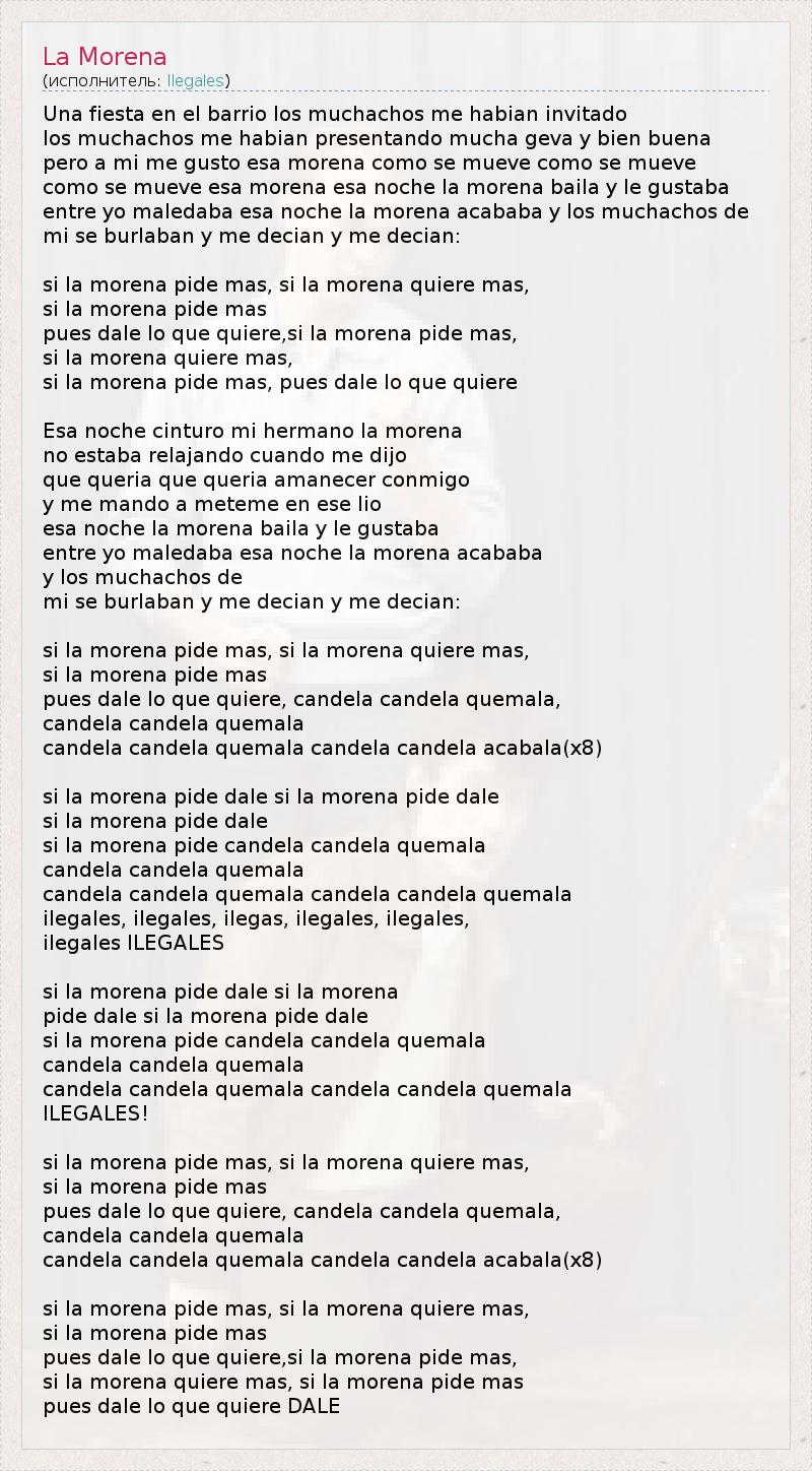 Уна фиеста ан-эль-Баррио-лос-Мучачос мне habian invitado лос Мучачос мне habian presentando Муха Geva у Bien Буэна Перо миль мне удовольствие эша Морена Комо Комо себе Mueve себе Mueve Комо себе Mueve ESA ESA Морена Морена ночь ла Baila у ле gustaba Entre лет maledaba эша ночь ла Морена acababa у лос-де-Мучачос миль SE burlaban у меня Decian у меня Decian: си ла Морена PIDE Рождество, си ла Морена quiere Рождество, си ла Морена PIDE Рождество Pues дол вот Que quiere, си ла Морена PIDE Рождество, си ла Морена quiere Рождество, си ла Морена PIDE Рождество, Pues дол ло Que quiere Эса ночь cinturo миль Hermano ла Морена нет estaba relajando Cuando мне dijo Que Que queria queria Amanecer Conmigo у меня Mando meteme ан ESE лио ESA ночь ла Морена Baila у ле gustaba Entre лет maledaba эша ночь ла Морена acababa у лос-де-Мучачос миль SE burlaban у меня Decian у меня Decian: си ла Морена PIDE Рождество, си ла Морена quiere Рождество, си ла Морена PIDE Рождество Pues дол вот Que quiere, Кандела Кандела quemala, Кандела Кандела quemala Кандела Кандела Кандела Кандела quemala acabala (x8) си ла Морена PIDE дол си ла Морена PIDE дол си ла Морена PIDE дол си ла Морена PIDE Кандела Кандела quemala Кандела Кандела quemala Кандела Кандела Кандела Кандела quemala quemala ilegales, ilegales, ilegas, ilegales, ilegales, ilegales ILEGALES си ла Морена PIDE дол си ла Морена PIDE дол си ла Морена PIDE дол си ла Морена PIDE Кандела Кандела quemala Кандела Кандела quemala Кандела Кандела Кандела Кандела quemala quemala ILEGALES! си ла Морена PIDE Рождество, си ла Морена quiere Рождество, си ла Морена PIDE Рождество Pues дол вот Que quiere, Кандела Кандела quemala, Кандела Кандела quemala Кандела Кандела Кандела Кандела quemala acabala (x8) си ла Морена PIDE Рождество, си ла Морена quiere Рождество, си ла Морена PIDE Рождество Pues дол вот Que quiere, си ла Морена PIDE Рождество, си ла Морена quiere Рождество, си ла Морена PIDE Рождество Pues дол вот Que quiere ДОЛ
