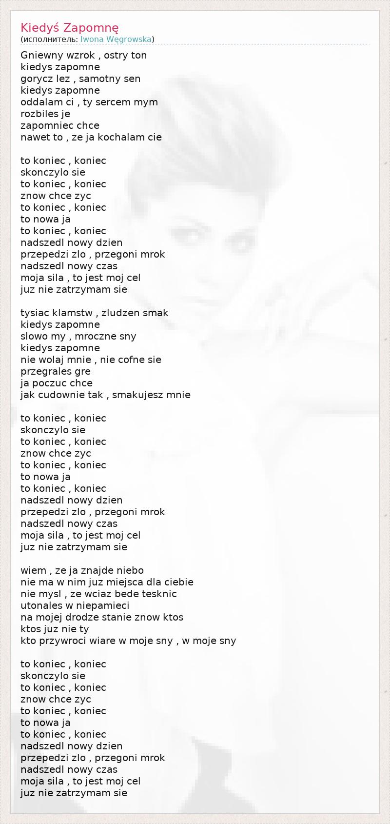 Gniewny wzrok , ostry ton kiedys zapomne gorycz lez , samotny sen kiedys zapomne oddalam ci , ty sercem mym rozbiles je zapomniec chce nawet to , ze ja kochalam cie to koniec , koniec skonczylo sie to koniec , koniec znow chce zyc to koniec , koniec to nowa ja to koniec , koniec nadszedl nowy dzien przepedzi zlo , przegoni mrok nadszedl nowy czas moja sila , to jest moj cel juz nie zatrzymam sie tysiac klamstw , zludzen smak kiedys zapomne slowo my , mroczne sny kiedys zapomne nie wolaj mnie , nie cofne sie przegrales gre ja poczuc chce jak cudownie tak , smakujesz mnie to koniec , koniec skonczylo sie to koniec , koniec znow chce zyc to koniec , koniec to nowa ja to koniec , koniec nadszedl nowy dzien przepedzi zlo , przegoni mrok nadszedl nowy czas moja sila , to jest moj cel juz nie zatrzymam sie wiem , ze ja znajde niebo nie ma w nim juz miejsca dla ciebie nie mysl , ze wciaz bede tesknic utonales w niepamieci na mojej drodze stanie znow ktos ktos juz nie ty kto przywroci wiare w moje sny , w moje sny to koniec , koniec skonczylo sie to koniec , koniec znow chce zyc to koniec , koniec to nowa ja to koniec , koniec nadszedl nowy dzien przepedzi zlo , przegoni mrok nadszedl nowy czas moja sila , to jest moj cel juz nie zatrzymam sie