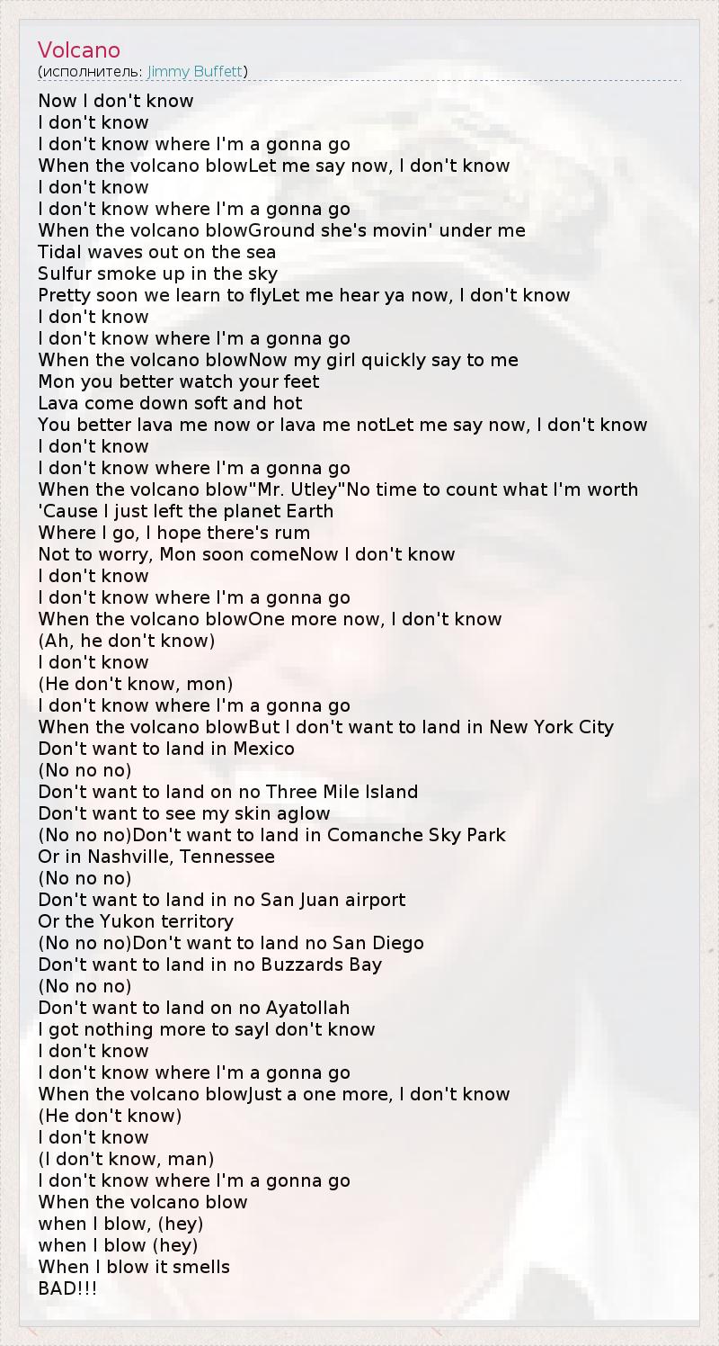 Now I don't know I don't know I don't know where I'm a gonna go When the volcano blowLet me say now, I don't know I don't know I don't know where I'm a gonna go When the volcano blowGround she's movin' under me Tidal waves out on the sea Sulfur smoke up in the sky Pretty soon we learn to flyLet me hear ya now, I don't know I don't know I don't know where I'm a gonna go When the volcano blowNow my girl quickly say to me Mon you better watch your feet Lava come down soft and hot You better lava me now or lava me notLet me say now, I don't know I don't know I don't know where I'm a gonna go When the volcano blow"Mr. Utley"No time to count what I'm worth 'Cause I just left the planet Earth Where I go, I hope there's rum Not to worry, Mon soon comeNow I don't know I don't know I don't know where I'm a gonna go When the volcano blowOne more now, I don't know (Ah, he don't know) I don't know (He don't know, mon) I don't know where I'm a gonna go When the volcano blowBut I don't want to land in New York City Don't want to land in Mexico (No no no) Don't want to land on no Three Mile Island Don't want to see my skin aglow (No no no)Don't want to land in Comanche Sky Park Or in Nashville, Tennessee (No no no) Don't want to land in no San Juan airport Or the Yukon territory (No no no)Don't want to land no San Diego Don't want to land in no Buzzards Bay (No no no) Don't want to land on no Ayatollah I got nothing more to sayI don't know I don't know I don't know where I'm a gonna go When the volcano blowJust a one more, I don't know (He don't know) I don't know (I don't know, man) I don't know where I'm a gonna go When the volcano blow when I blow, (hey) when I blow (hey) When I blow it smells BAD!!!