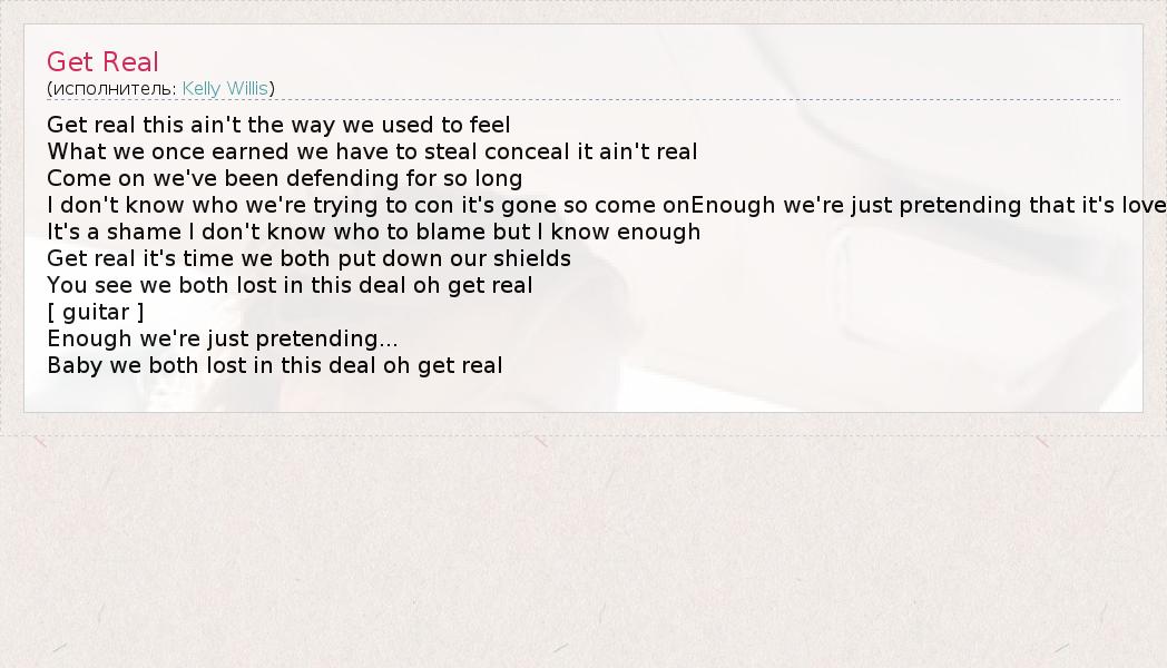 Get real this ain't the way we used to feel What we once earned we have to steal conceal it ain't real Come on we've been defending for so long I don't know who we're trying to con it's gone so come onEnough we're just pretending that it's love It's a shame I don't know who to blame but I know enough Get real it's time we both put down our shields You see we both lost in this deal oh get real [ guitar ] Enough we're just pretending... Baby we both lost in this deal oh get real