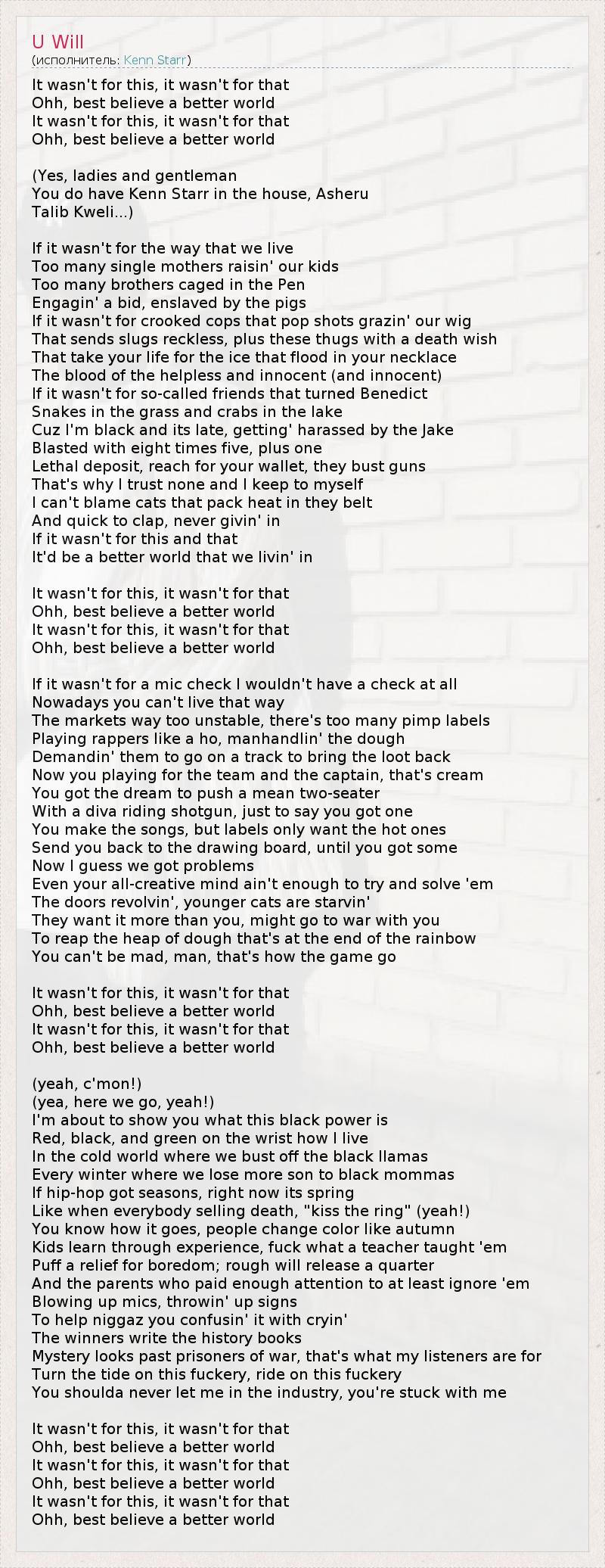 It wasn't for this, it wasn't for that Ohh, best believe a better world It wasn't for this, it wasn't for that Ohh, best believe a better world (Yes, ladies and gentleman You do have Kenn Starr in the house, Asheru Talib Kweli...) If it wasn't for the way that we live Too many single mothers raisin' our kids Too many brothers caged in the Pen Engagin' a bid, enslaved by the pigs If it wasn't for crooked cops that pop shots grazin' our wig That sends slugs reckless, plus these thugs with a death wish That take your life for the ice that flood in your necklace The blood of the helpless and innocent (and innocent) If it wasn't for so-called friends that turned Benedict Snakes in the grass and crabs in the lake Cuz I'm black and its late, getting' harassed by the Jake Blasted with eight times five, plus one Lethal deposit, reach for your wallet, they bust guns That's why I trust none and I keep to myself I can't blame cats that pack heat in they belt And quick to clap, never givin' in If it wasn't for this and that It'd be a better world that we livin' in It wasn't for this, it wasn't for that Ohh, best believe a better world It wasn't for this, it wasn't for that Ohh, best believe a better world If it wasn't for a mic check I wouldn't have a check at all Nowadays you can't live that way The markets way too unstable, there's too many pimp labels Playing rappers like a ho, manhandlin' the dough Demandin' them to go on a track to bring the loot back Now you playing for the team and the captain, that's cream You got the dream to push a mean two-seater With a diva riding shotgun, just to say you got one You make the songs, but labels only want the hot ones Send you back to the drawing board, until you got some Now I guess we got problems Even your all-creative mind ain't enough to try and solve 'em The doors revolvin', younger cats are starvin' They want it more than you, might go to war with you To reap the heap of dough that's at the end of the rainbow You can't be mad, man, that's how the game go It wasn't for this, it wasn't for that Ohh, best believe a better world It wasn't for this, it wasn't for that Ohh, best believe a better world (yeah, c'mon!) (yea, here we go, yeah!) I'm about to show you what this black power is Red, black, and green on the wrist how I live In the cold world where we bust off the black llamas Every winter where we lose more son to black mommas If hip-hop got seasons, right now its spring Like when everybody selling death, "kiss the ring" (yeah!) You know how it goes, people change color like autumn Kids learn through experience, fuck what a teacher taught 'em Puff a relief for boredom; rough will release a quarter And the parents who paid enough attention to at least ignore 'em Blowing up mics, throwin' up signs To help niggaz you confusin' it with cryin' The winners write the history books Mystery looks past prisoners of war, that's what my listeners are for Turn the tide on this fuckery, ride on this fuckery You shoulda never let me in the industry, you're stuck with me It wasn't for this, it wasn't for that Ohh, best believe a better world It wasn't for this, it wasn't for that Ohh, best believe a better world It wasn't for this, it wasn't for that Ohh, best believe a better world