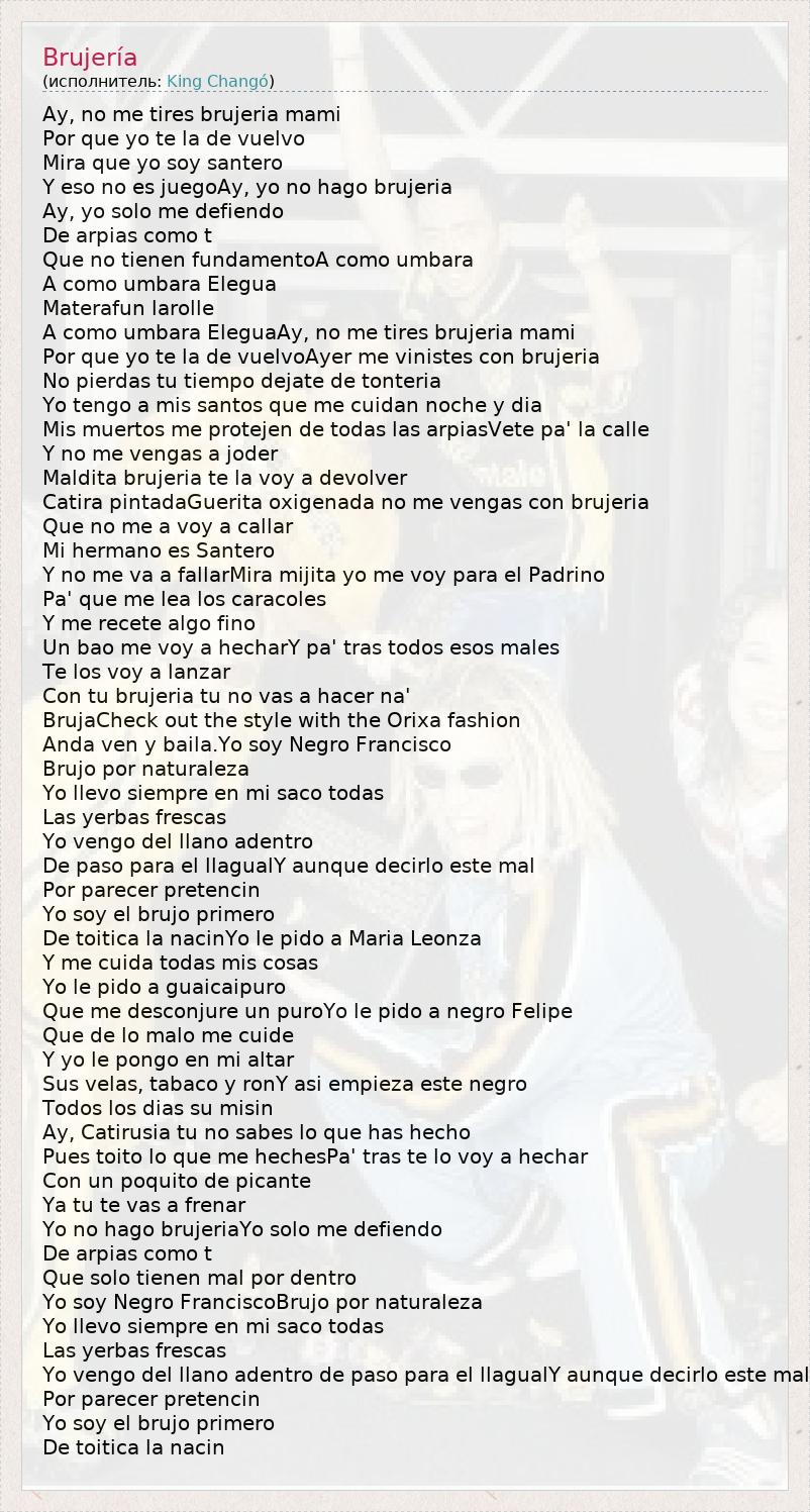 Ay, no me tires brujeria mami Por que yo te la de vuelvo Mira que yo soy santero Y eso no es juegoAy, yo no hago brujeria Ay, yo solo me defiendo De arpias como t Que no tienen fundamentoA como umbara A como umbara Elegua Materafun larolle A como umbara EleguaAy, no me tires brujeria mami Por que yo te la de vuelvoAyer me vinistes con brujeria No pierdas tu tiempo dejate de tonteria Yo tengo a mis santos que me cuidan noche y dia Mis muertos me protejen de todas las arpiasVete pa' la calle Y no me vengas a joder Maldita brujeria te la voy a devolver Catira pintadaGuerita oxigenada no me vengas con brujeria Que no me a voy a callar Mi hermano es Santero Y no me va a fallarMira mijita yo me voy para el Padrino Pa' que me lea los caracoles Y me recete algo fino Un bao me voy a hecharY pa' tras todos esos males Te los voy a lanzar Con tu brujeria tu no vas a hacer na' BrujaCheck out the style with the Orixa fashion Anda ven y baila.Yo soy Negro Francisco Brujo por naturaleza Yo llevo siempre en mi saco todas Las yerbas frescas Yo vengo del llano adentro De paso para el llagualY aunque decirlo este mal Por parecer pretencin Yo soy el brujo primero De toitica la nacinYo le pido a Maria Leonza Y me cuida todas mis cosas Yo le pido a guaicaipuro Que me desconjure un puroYo le pido a negro Felipe Que de lo malo me cuide Y yo le pongo en mi altar Sus velas, tabaco y ronY asi empieza este negro Todos los dias su misin Ay, Catirusia tu no sabes lo que has hecho Pues toito lo que me hechesPa' tras te lo voy a hechar Con un poquito de picante Ya tu te vas a frenar Yo no hago brujeriaYo solo me defiendo De arpias como t Que solo tienen mal por dentro Yo soy Negro FranciscoBrujo por naturaleza Yo llevo siempre en mi saco todas Las yerbas frescas Yo vengo del llano adentro de paso para el llagualY aunque decirlo este mal Por parecer pretencin Yo soy el brujo primero De toitica la nacin