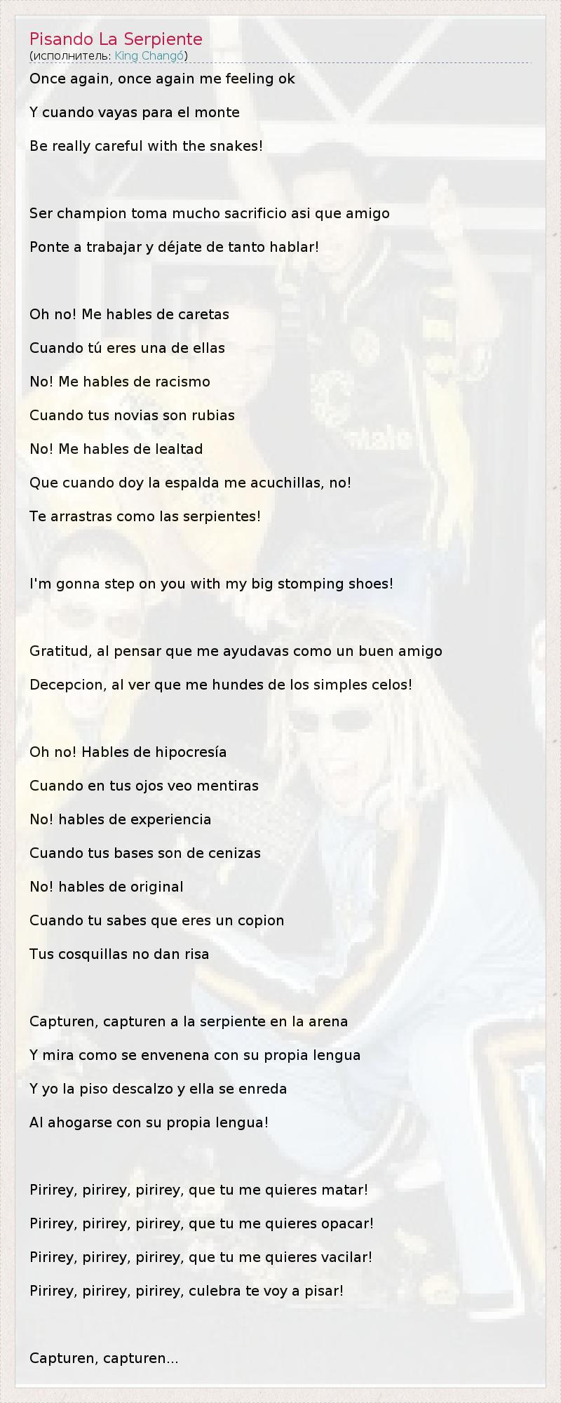Once again, once again me feeling ok Y cuando vayas para el monte Be really careful with the snakes! Ser champion toma mucho sacrificio asi que amigo Ponte a trabajar y déjate de tanto hablar! Oh no! Me hables de caretas Cuando tú eres una de ellas No! Me hables de racismo Cuando tus novias son rubias No! Me hables de lealtad Que cuando doy la espalda me acuchillas, no! Te arrastras como las serpientes! I'm gonna step on you with my big stomping shoes! Gratitud, al pensar que me ayudavas como un buen amigo Decepcion, al ver que me hundes de los simples celos! Oh no! Hables de hipocresía Cuando en tus ojos veo mentiras No! hables de experiencia Cuando tus bases son de cenizas No! hables de original Cuando tu sabes que eres un copion Tus cosquillas no dan risa Capturen, capturen a la serpiente en la arena Y mira como se envenena con su propia lengua Y yo la piso descalzo y ella se enreda Al ahogarse con su propia lengua! Pirirey, pirirey, pirirey, que tu me quieres matar! Pirirey, pirirey, pirirey, que tu me quieres opacar! Pirirey, pirirey, pirirey, que tu me quieres vacilar! Pirirey, pirirey, pirirey, culebra te voy a pisar! Capturen, capturen...
