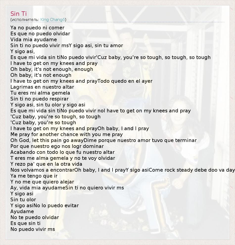 Ya no puedo ni comer Es que no puedo olvidar Vida mia ayudame Sin ti no puedo vivir msY sigo asi, sin tu amor Y sigo asi, Es que mi vida sin tiNo puedo vivir'Cuz baby, you're so tough, so tough, so tough I have to get on my knees and pray Oh baby, it's not enough, enough Oh baby, it's not enough I have to get on my knees and prayTodo quedo en el ayer Lagrimas en nuestro altar Tu eres mi alma gemela Sin ti no puedo respirar Y sigo asi, sin tu olor y sigo asi Es que mi vida sin tiNo puedo vivir noI have to get on my knees and pray 'Cuz baby, you're so tough, so tough 'Cuz baby, you're so tough I have to get on my knees and prayOh baby, I and I pray Me pray for another chance with you me pray Oh God, let this pain go awayDime porque nuestro amor tuvo que terminar Por que nuestro ego nos logr dominar Acabando con todo lo que fu nuestro altar T eres me alma gemela y no te voy olvidar Y rezo pa' que en la otra vida Nos volvamos a encontrarOh baby, I and I prayY sigo asiCome rock steady debe doo va day Ya me tengo que ir Y no me que quiero alejar Ay, vida mia ayudameSin ti no quiero vivir ms Y sigo asi Sin tu olor Y sigo asiNo lo puedo evitar Ayudame No te puedo olvidar Es que sin ti No puedo vivir ms