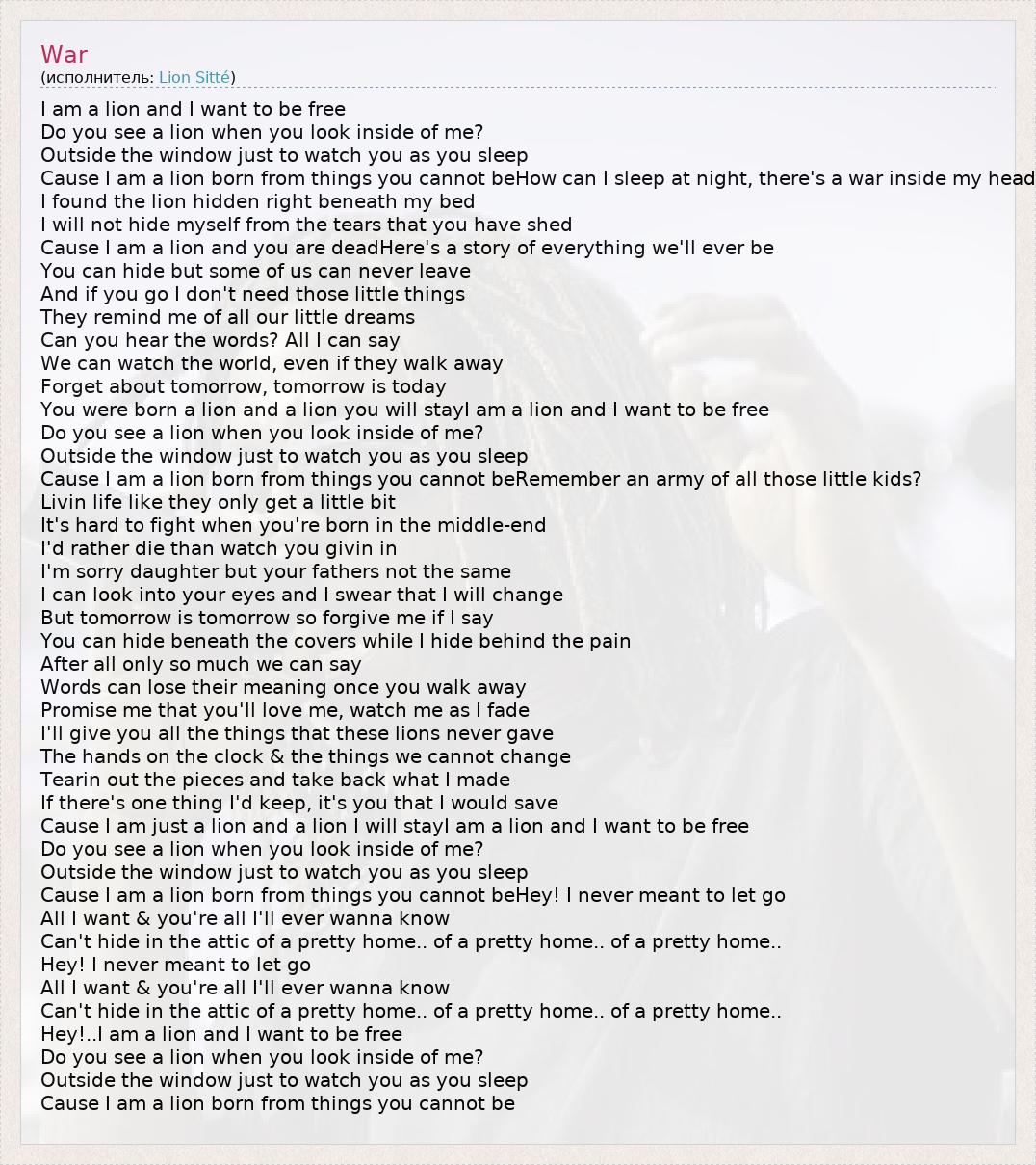 I am a lion and I want to be free Do you see a lion when you look inside of me? Outside the window just to watch you as you sleep Cause I am a lion born from things you cannot beHow can I sleep at night, there's a war inside my head I found the lion hidden right beneath my bed I will not hide myself from the tears that you have shed Cause I am a lion and you are deadHere's a story of everything we'll ever be You can hide but some of us can never leave And if you go I don't need those little things They remind me of all our little dreams Can you hear the words? All I can say We can watch the world, even if they walk away Forget about tomorrow, tomorrow is today You were born a lion and a lion you will stayI am a lion and I want to be free Do you see a lion when you look inside of me? Outside the window just to watch you as you sleep Cause I am a lion born from things you cannot beRemember an army of all those little kids? Livin life like they only get a little bit It's hard to fight when you're born in the middle-end I'd rather die than watch you givin in I'm sorry daughter but your fathers not the same I can look into your eyes and I swear that I will change But tomorrow is tomorrow so forgive me if I say You can hide beneath the covers while I hide behind the pain After all only so much we can say Words can lose their meaning once you walk away Promise me that you'll love me, watch me as I fade I'll give you all the things that these lions never gave The hands on the clock & the things we cannot change Tearin out the pieces and take back what I made If there's one thing I'd keep, it's you that I would save Cause I am just a lion and a lion I will stayI am a lion and I want to be free Do you see a lion when you look inside of me? Outside the window just to watch you as you sleep Cause I am a lion born from things you cannot beHey! I never meant to let go All I want & you're all I'll ever wanna know Can't hide in the attic of a pretty home.. of a pretty home.. of a pretty home.. Hey! I never meant to let go All I want & you're all I'll ever wanna know Can't hide in the attic of a pretty home.. of a pretty home.. of a pretty home.. Hey!..I am a lion and I want to be free Do you see a lion when you look inside of me? Outside the window just to watch you as you sleep Cause I am a lion born from things you cannot be