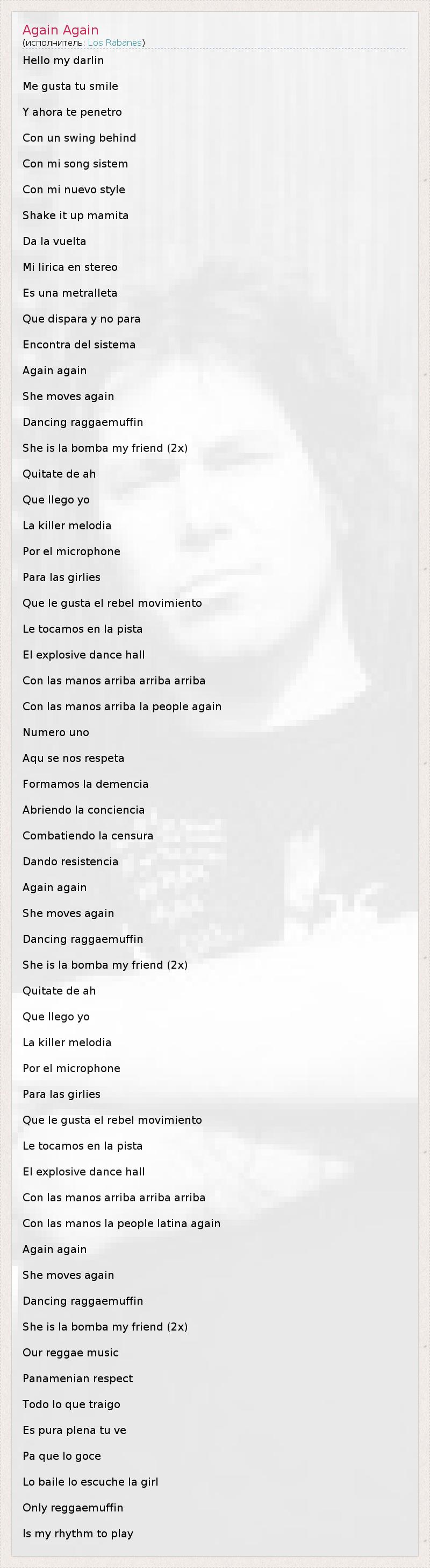 Hello my darlin Me gusta tu smile Y ahora te penetro Con un swing behind Con mi song sistem Con mi nuevo style Shake it up mamita Da la vuelta Mi lirica en stereo Es una metralleta Que dispara y no para Encontra del sistema Again again She moves again Dancing raggaemuffin She is la bomba my friend (2x) Quitate de ah Que llego yo La killer melodia Por el microphone Para las girlies Que le gusta el rebel movimiento Le tocamos en la pista El explosive dance hall Con las manos arriba arriba arriba Con las manos arriba la people again Numero uno Aqu se nos respeta Formamos la demencia Abriendo la conciencia Combatiendo la censura Dando resistencia Again again She moves again Dancing raggaemuffin She is la bomba my friend (2x) Quitate de ah Que llego yo La killer melodia Por el microphone Para las girlies Que le gusta el rebel movimiento Le tocamos en la pista El explosive dance hall Con las manos arriba arriba arriba Con las manos la people latina again Again again She moves again Dancing raggaemuffin She is la bomba my friend (2x) Our reggae music Panamenian respect Todo lo que traigo Es pura plena tu ve Pa que lo goce Lo baile lo escuche la girl Only reggaemuffin Is my rhythm to play
