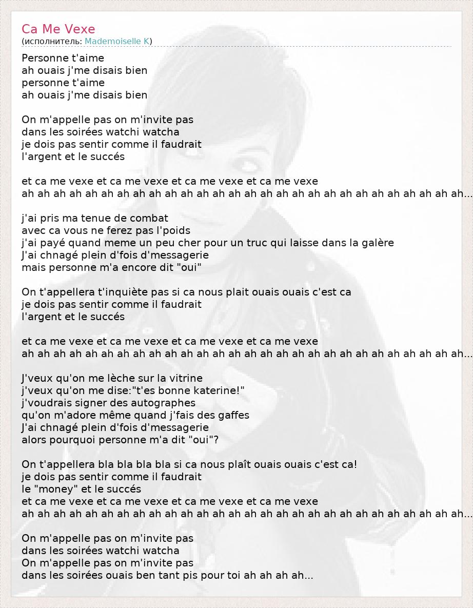 Personne t'aime ah ouais j'me disais bien personne t'aime ah ouais j'me disais bien On m'appelle pas on m'invite pas dans les soirées watchi watcha je dois pas sentir comme il faudrait l'argent et le succés et ca me vexe et ca me vexe et ca me vexe et ca me vexe ah ah ah ah ah ah ah ah ah ah ah ah ah ah ah ah ah ah ah ah ah ah ah ah ah ah ah ah... j'ai pris ma tenue de combat avec ca vous ne ferez pas l'poids j'ai payé quand meme un peu cher pour un truc qui laisse dans la galère J'ai chnagé plein d'fois d'messagerie mais personne m'a encore dit "oui" On t'appellera t'inquiète pas si ca nous plait ouais ouais c'est ca je dois pas sentir comme il faudrait l'argent et le succés et ca me vexe et ca me vexe et ca me vexe et ca me vexe ah ah ah ah ah ah ah ah ah ah ah ah ah ah ah ah ah ah ah ah ah ah ah ah ah ah ah ah... J'veux qu'on me lèche sur la vitrine j'veux qu'on me dise:"t'es bonne katerine!" j'voudrais signer des autographes qu'on m'adore même quand j'fais des gaffes J'ai chnagé plein d'fois d'messagerie alors pourquoi personne m'a dit "oui"? On t'appellera bla bla bla bla si ca nous plaît ouais ouais c'est ca! je dois pas sentir comme il faudrait le "money" et le succés et ca me vexe et ca me vexe et ca me vexe et ca me vexe ah ah ah ah ah ah ah ah ah ah ah ah ah ah ah ah ah ah ah ah ah ah ah ah ah ah ah ah... On m'appelle pas on m'invite pas dans les soirées watchi watcha On m'appelle pas on m'invite pas dans les soirées ouais ben tant pis pour toi ah ah ah ah...