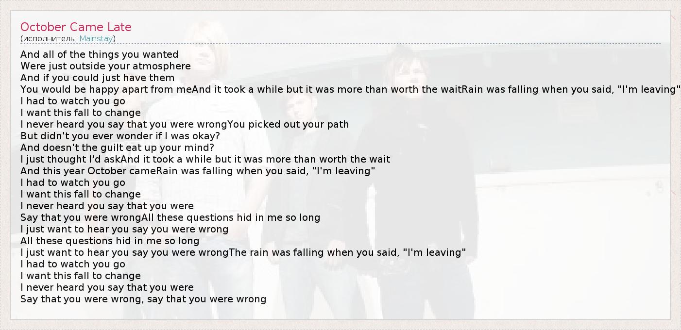 And all of the things you wanted Were just outside your atmosphere And if you could just have them You would be happy apart from meAnd it took a while but it was more than worth the waitRain was falling when you said, "I'm leaving" I had to watch you go I want this fall to change I never heard you say that you were wrongYou picked out your path But didn't you ever wonder if I was okay? And doesn't the guilt eat up your mind? I just thought I'd askAnd it took a while but it was more than worth the wait And this year October cameRain was falling when you said, "I'm leaving" I had to watch you go I want this fall to change I never heard you say that you were Say that you were wrongAll these questions hid in me so long I just want to hear you say you were wrong All these questions hid in me so long I just want to hear you say you were wrongThe rain was falling when you said, "I'm leaving" I had to watch you go I want this fall to change I never heard you say that you were Say that you were wrong, say that you were wrong